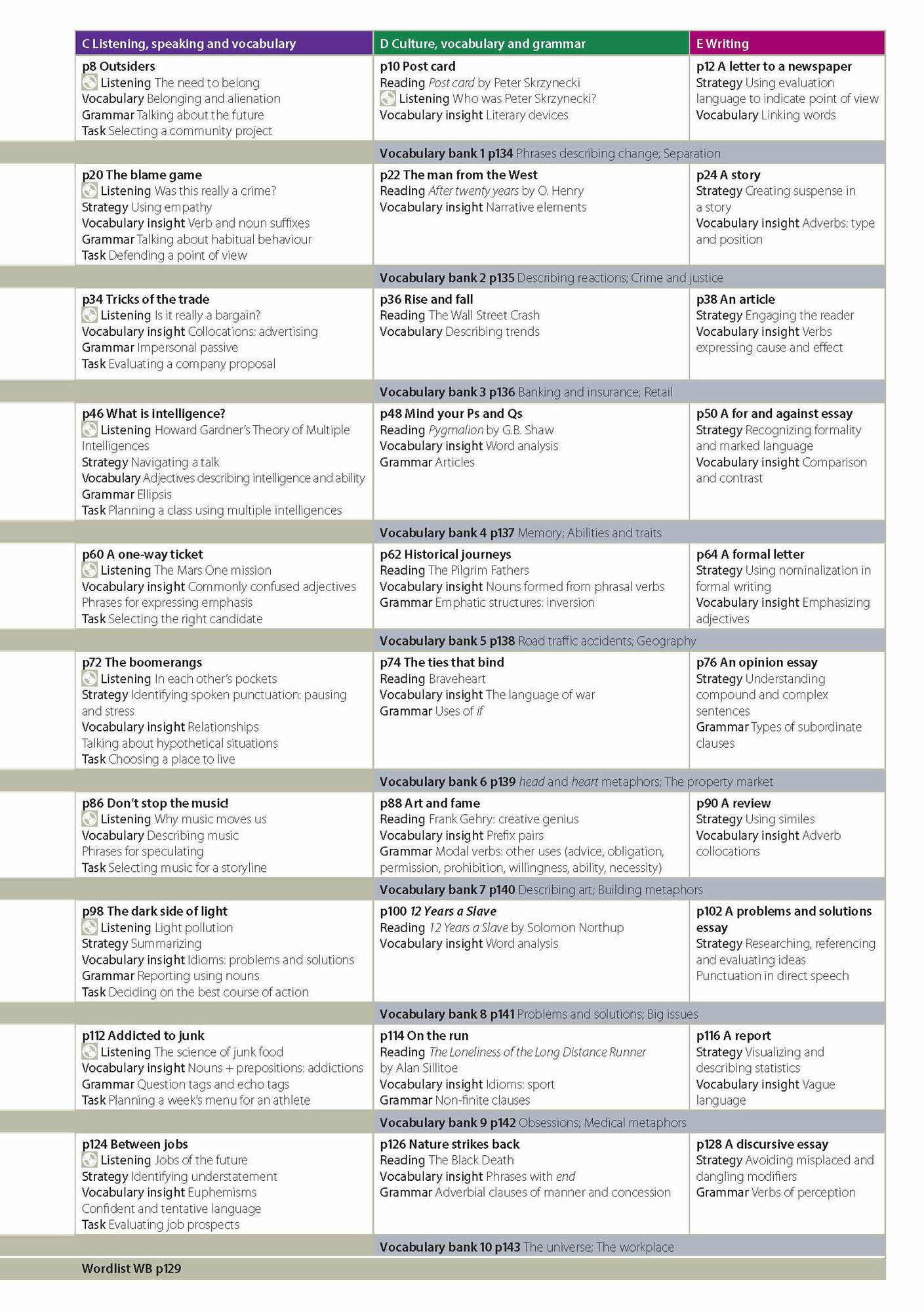 Strategy boxes in every unit help students gradually develop their skills by working on specific aspects of grammar and vocabulary in each unit, e.g. identifying paraphrase, taking notes, and writing opening sentences.