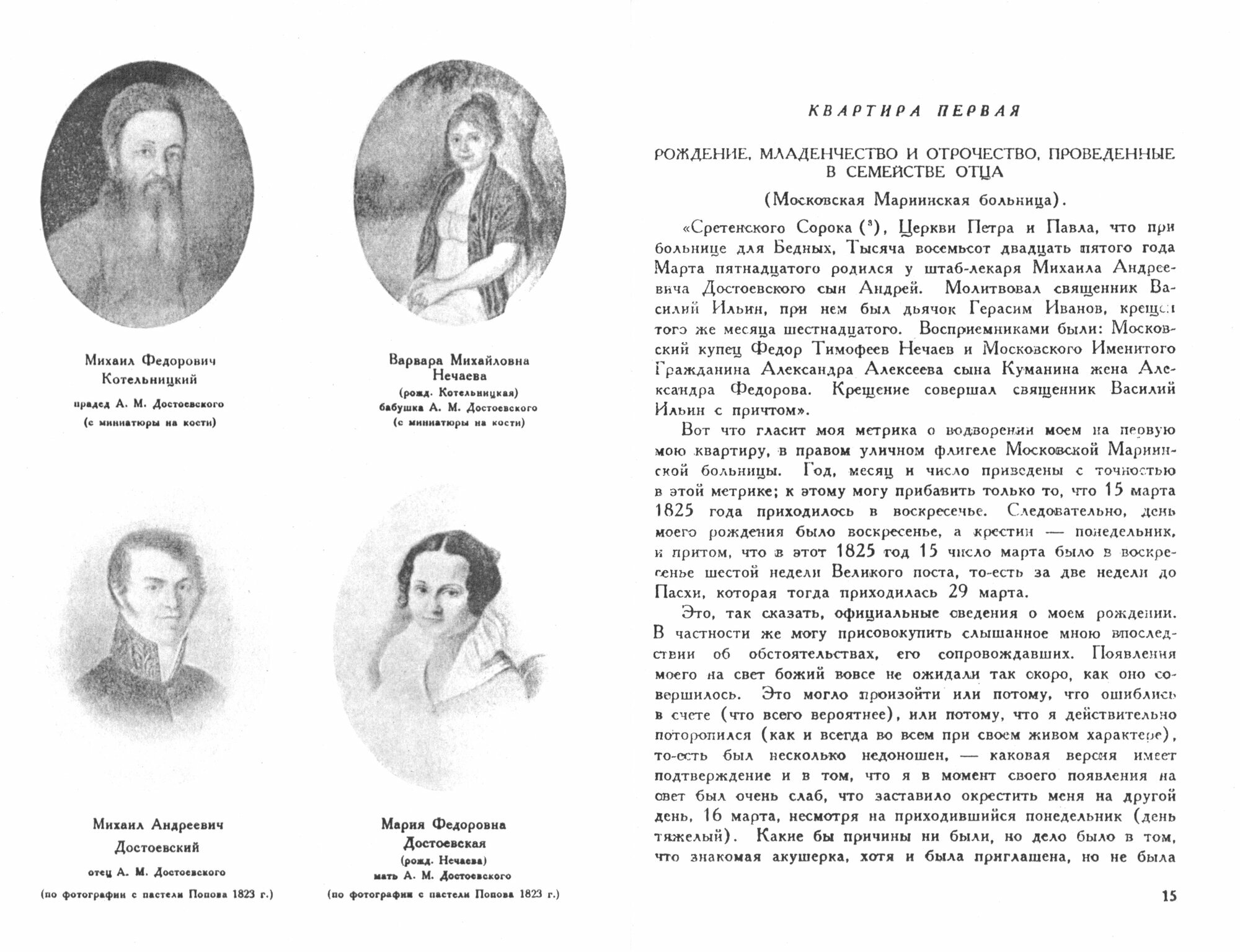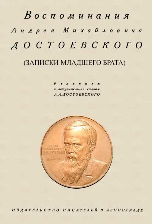 Репринт с издания. Ленинград, 1930. Андрей Михайлович Достоевский (1825 — 1897) — русский архитектор и мемуарист. Младший брат писателя Ф. М. Достоевского. Андрей Михайлович не был так близок с Фёдором, как старший брат, тоже писатель, Михаил, но был весьма дружен с ним. Они переписывались до конца жизни, и Андрей Михайлович написал свои «Воспоминания» (впервые полностью были изданы в 1930 году и именно репринт этого издания мы и предлагаем Вашему вниманию) — бесценный и достоверный источник сведений о ранних годах великого писателя. Ещё в 1875 году Андрей Михайлович решил составить записки о всей своей жизни весьма интересным способом — поквартирно, что для архитектора было весьма понятно. Разделы мемуаров были названы не главами, а квартирами. Однако начатые в том же году записки охватили только историю его детства и были автором прерваны. Летом 1895 года его навестил младший сын Андрей, который и попросил возобновить записки, прерванные отцом двадцать лет назад. После отъезда сына Андрей Михайлович продолжил свои записки.