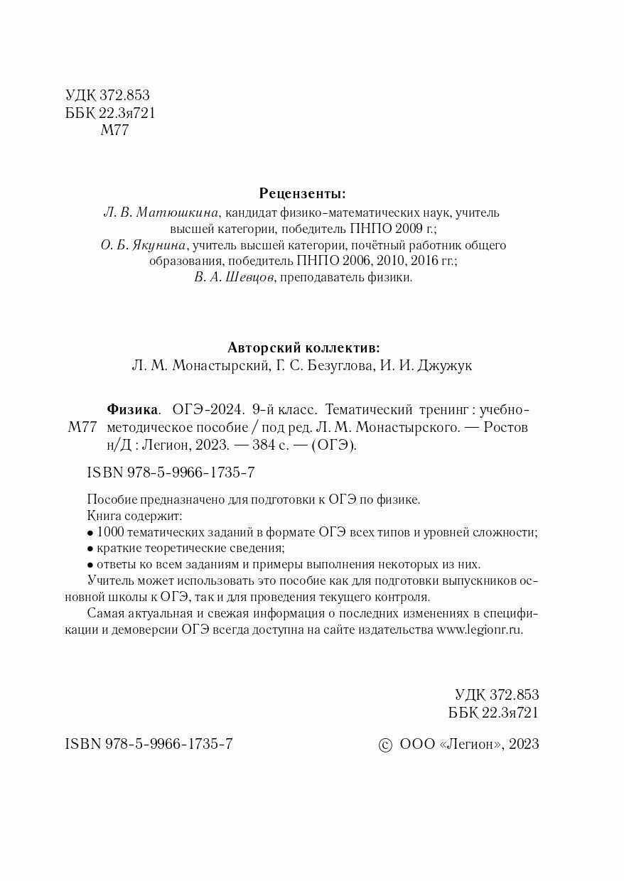 Сервис сравнения цен СкидкаГИД предлагает сравнить цены на товар «Книга: Физика. ОГЭ-2024. 9 класс. Тематический тренинг (Монастырский Лев Михайлович, Безуглова Галина Сергеевна, Джужук Игорь Иванович); Легион, 2023»