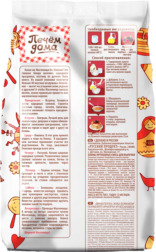 Какая же Масленица без блинов? Это главное блюдо веселого народного праздника, поэтому их должно быть много. Из нашей упаковки получится больше 40 вкусных воздушных блинчиков - хватит на угощение всем родным и друзьям!