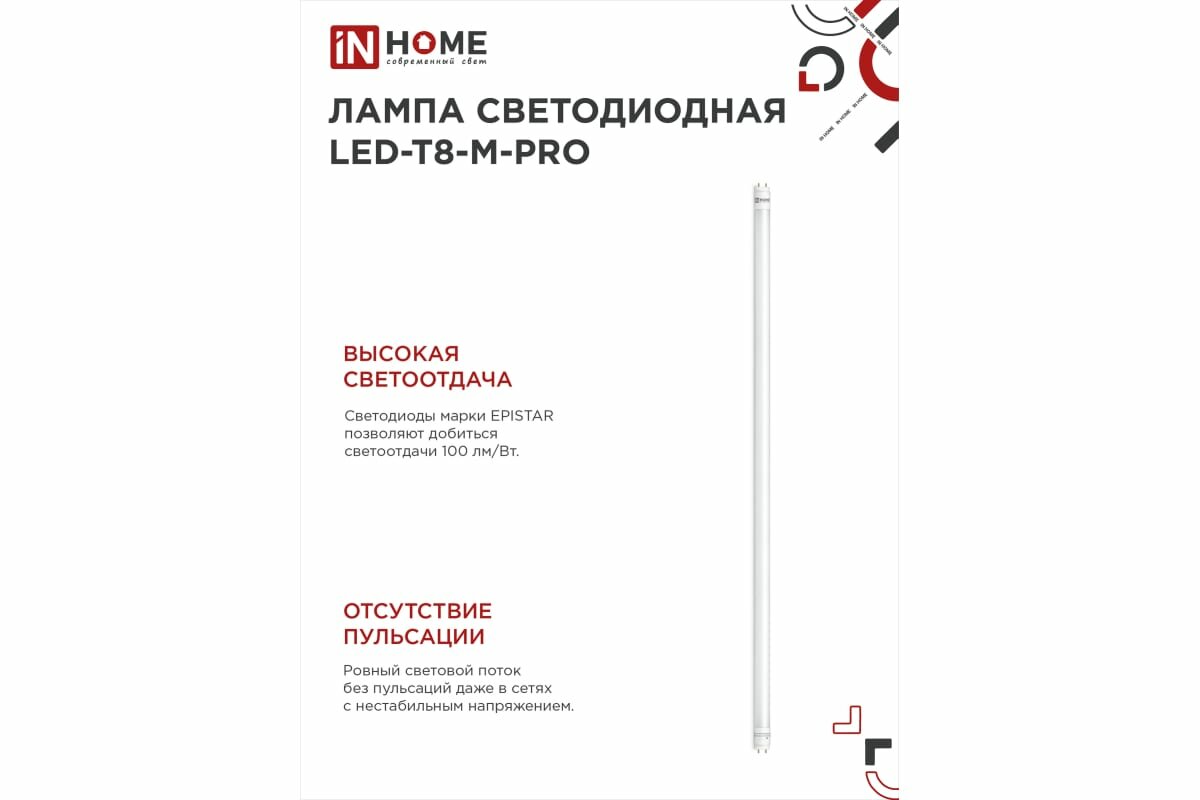 Лампа LED-T8-М-PRO ТМ IN HOME послужит достойной заменой люминесцентных ламп Т8 при модернизации осветительных систем стандарта ЛПО, ЛВО. Светодиодные лампы сочетают в себе: минимальное энергопотребление, высокую светоотдачу, удароустойчивость и долгий срок службы (не менее 30 тысяч часов). Лампы соответствуют всем санитарным и гигиеническим требованиям, не мигают и не вредят зрению (коэффициент пульсации – менее 5%).