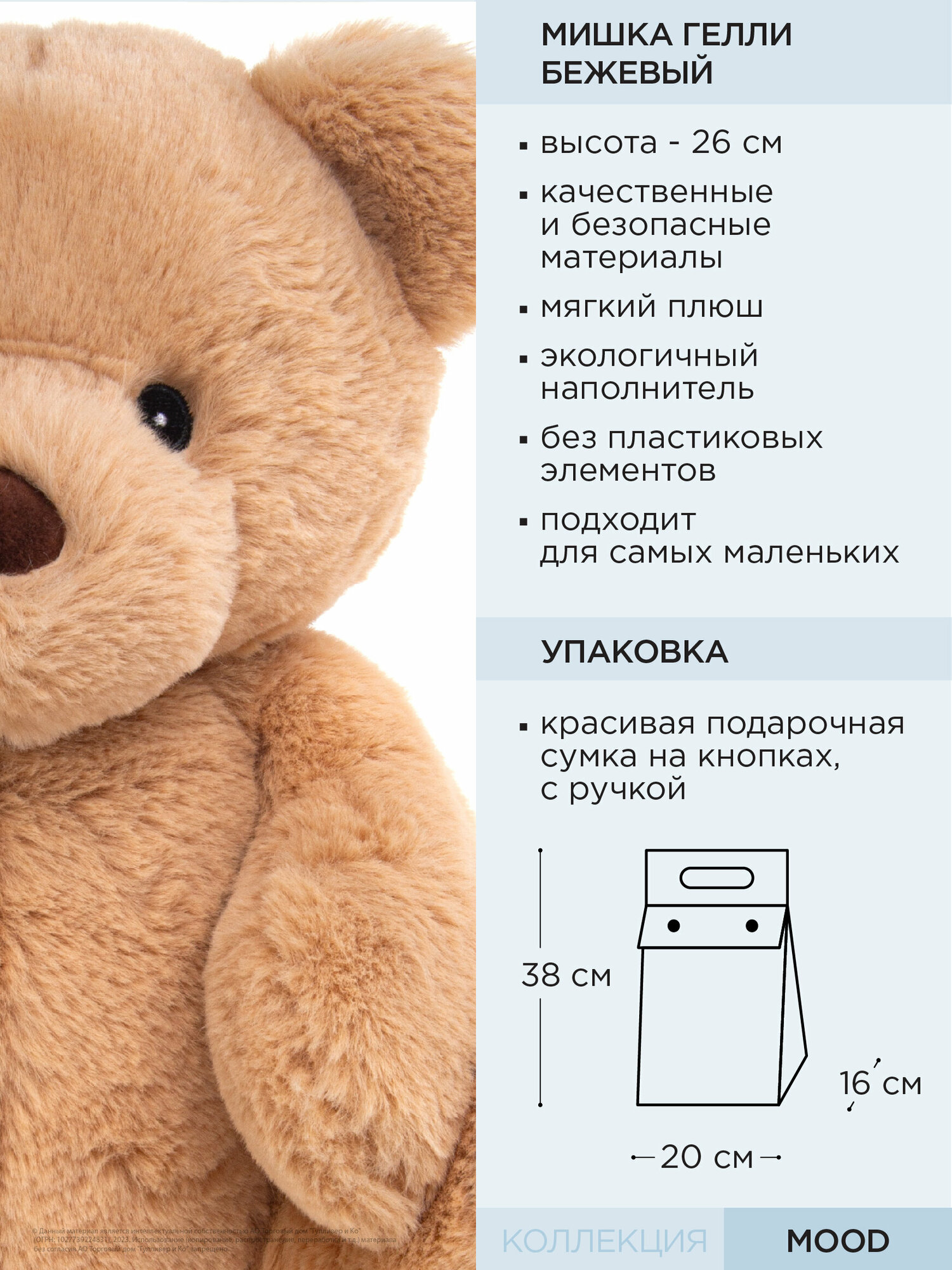 Плюшевый мишка Гелли в красивом бежевом цвете из коллекции Mood мягких игрушек Gulliver - желанный подарок для любого ребенка. С таким другом не хочется расставаться, даже повзрослев. Мишка плюшевый мягкий, пушистый, тактильно приятный, его можно использовать как антистресс игрушку и игрушку обнимашку. У медведя вышитые черные глазки и коричневый плюшевый нос. Мягкая игрушка мишка подойдет в качестве подарка не только ребенку, но и взрослому. Мягкие мишки - отличный подарок на День Рождения, Новый год, Рождество, 8 марта, 14 февраля. Посадив мишку тедди на диван или кровать, он добавит уюта в гостиную или спальню. Мягкая игрушка медведь упакована в плотную прозрачную брендированную сумочку на кнопках, которую можно использовать многократно. Высота игрушки сидя - 26 см. Мягкий мишка сидячий, лапки не разгибаются. Игрушка мишка мягкая стирается в щадящем режиме при температуре не более 30' и низких оборотах. Игрушка изготовлена из безопасных гипоаллергенных материалов. Товар сертифицирован. В коллекции Mood также представлены и другие интересные игрушки - плюшевый зайка, плюшевая собака, мягкая ишрушка динозавр, кролик игрушка и др.