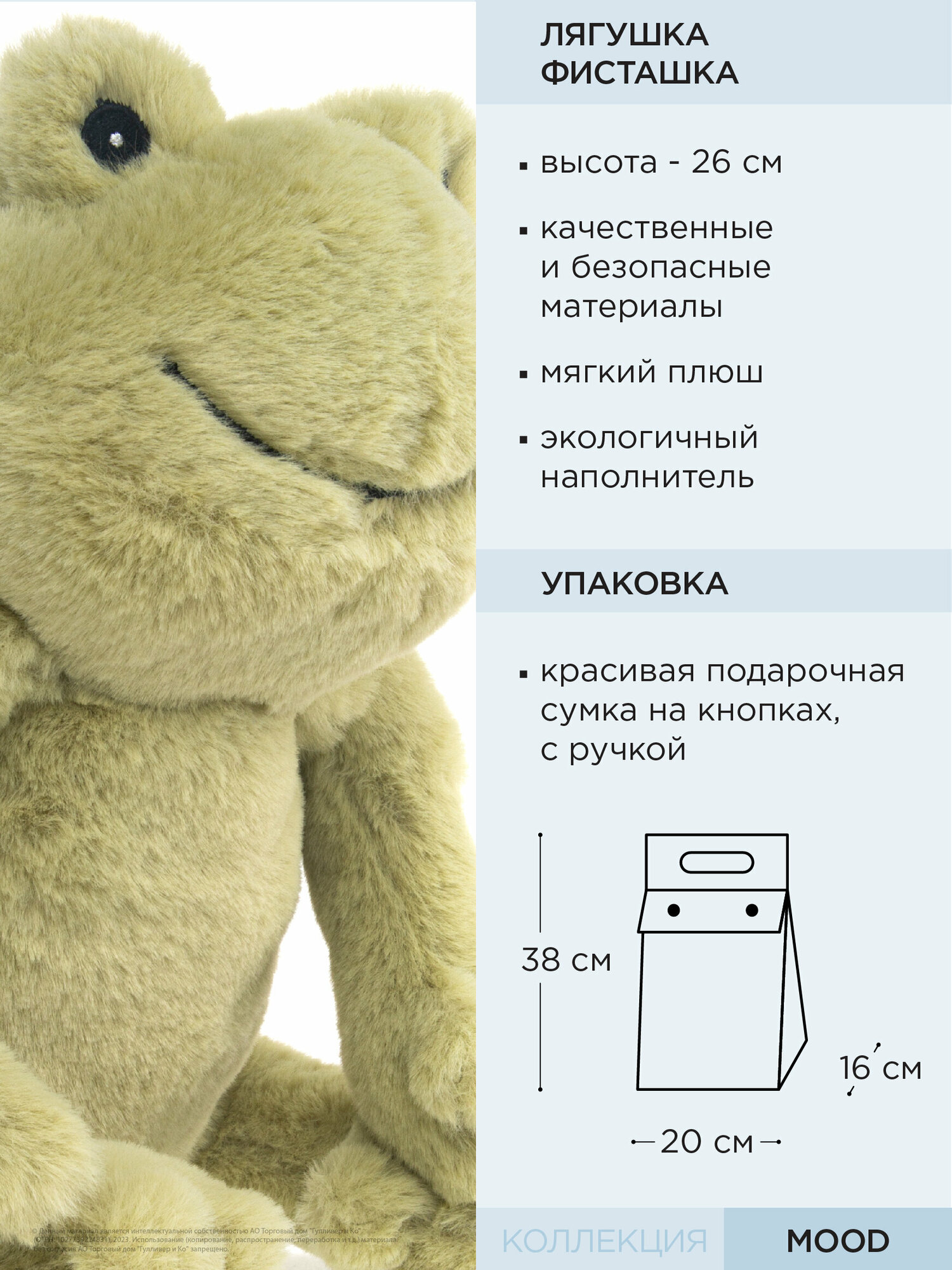 Лягушка Фисташка из коллекции "Mood" - самая обаятельная лягушка на свете. Она красивого фисташкового цвета, с вышитыми глазками и широкой улыбкой. Фисташка уверенно сидит в забавной позе, поэтому она прекрасно справляется с ролью интерьерной игрушки и способна украсить как детскую комнату так и пространство для взрослых. Лягушка изготовлена из качественного коротковорсного меха и очень приятна на ощупь. Игрушка упакована в плотную прозрачную брендированную сумочку на кнопках, которая одновременно служит и подарочной упаковкой. Высота лягушки в сидячем положении - 26 см. Игрушку можно стирать в щадящем режиме при температуре не более 30' и низких оборотах. Игрушка изготовлена из безопасных гипоаллергенных материалов. Товар сертифицирован.