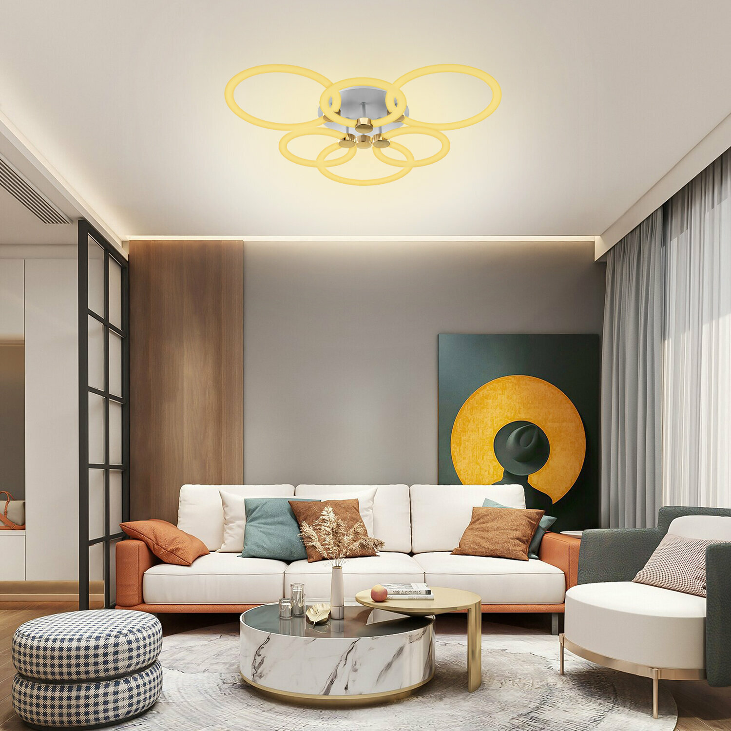 **Люстра потолочная светодиодная диммируемая Ritter Ottimo 51613 6** может крепиться к низкому и натяжному потолкам при помощи планки. Выполнена в виде шести светящихся колец — трех маленьких и трех больших. Для управления используются три способа: настенный выключатель, пульт ДУ или голосовой помощник Алиса.