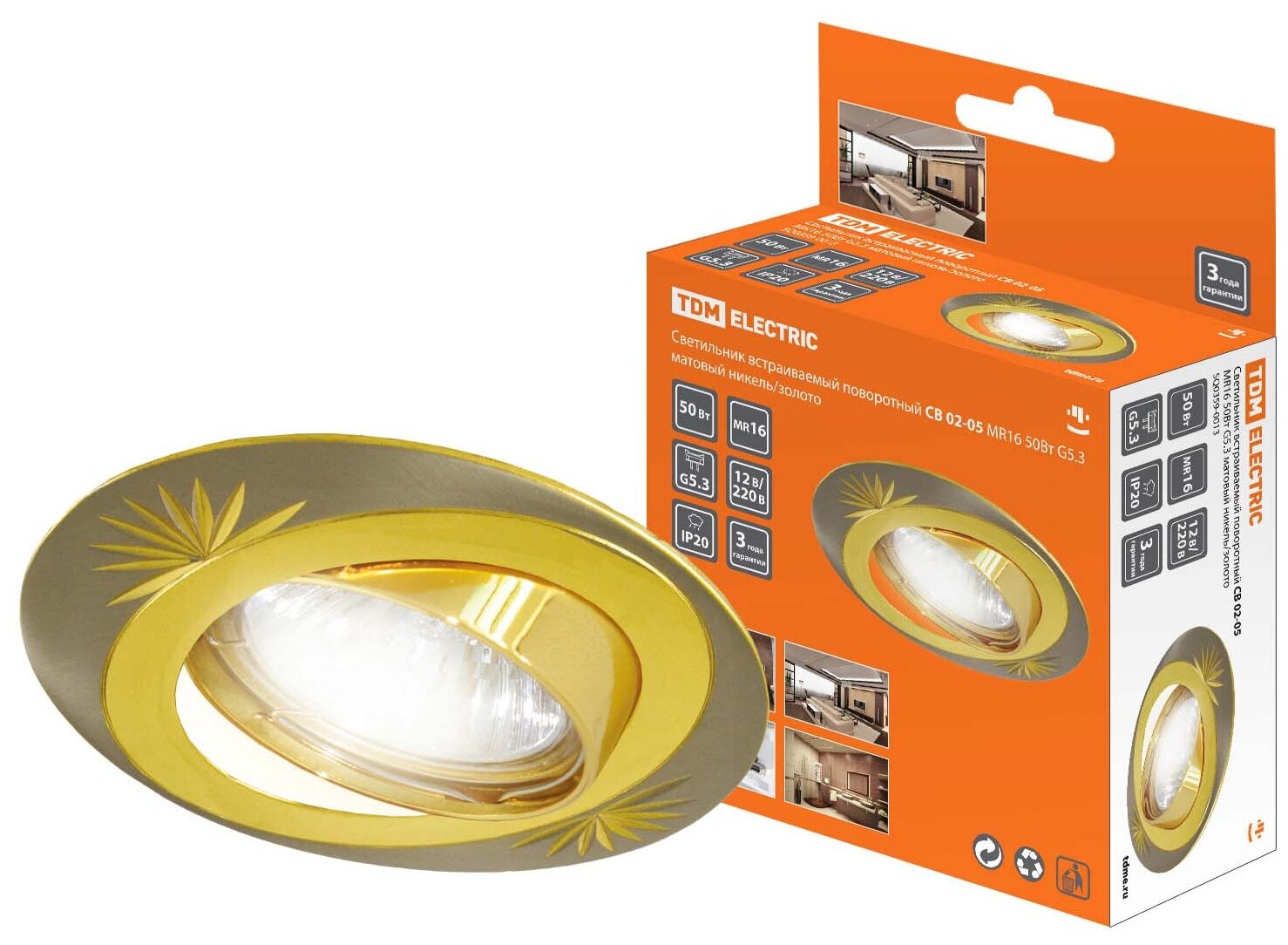 Мощный встраиваемый поворотный светильник СВ 02-05 SQ0359-0013 и высотой 26 мм, с цоколем G5,3, торговой марки TDM - хороший выбор для всеобщего освещения бытовых помещений (комнат, рабочих кабинетов и прочих помещений), в роли искусственной подсветки, подсветки рабочего места, стеллажей, проемов, витрин магазинов. Данная модель имеет возможность регулировки направления света. Традиционная галогенная лампа низкого напряжения MR16, мощностью 50 Вт, абсолютно безвредна для зрения людей и имеет увеличенный срок службы - 10000 ч. Прочный корпус изделия произведен из технологичного материала - сталь, в актуальном для большинства интерьеров цвете золото/никель с матовой поверхностью и обладает влагозащитой степени IP20, а также классом защиты - I. Светильник предназначается для работы в электроцепи с номинальным напряжением 12 В. Тип пускорегулирующего аппарата (ПРА) - электронный трансформатор.