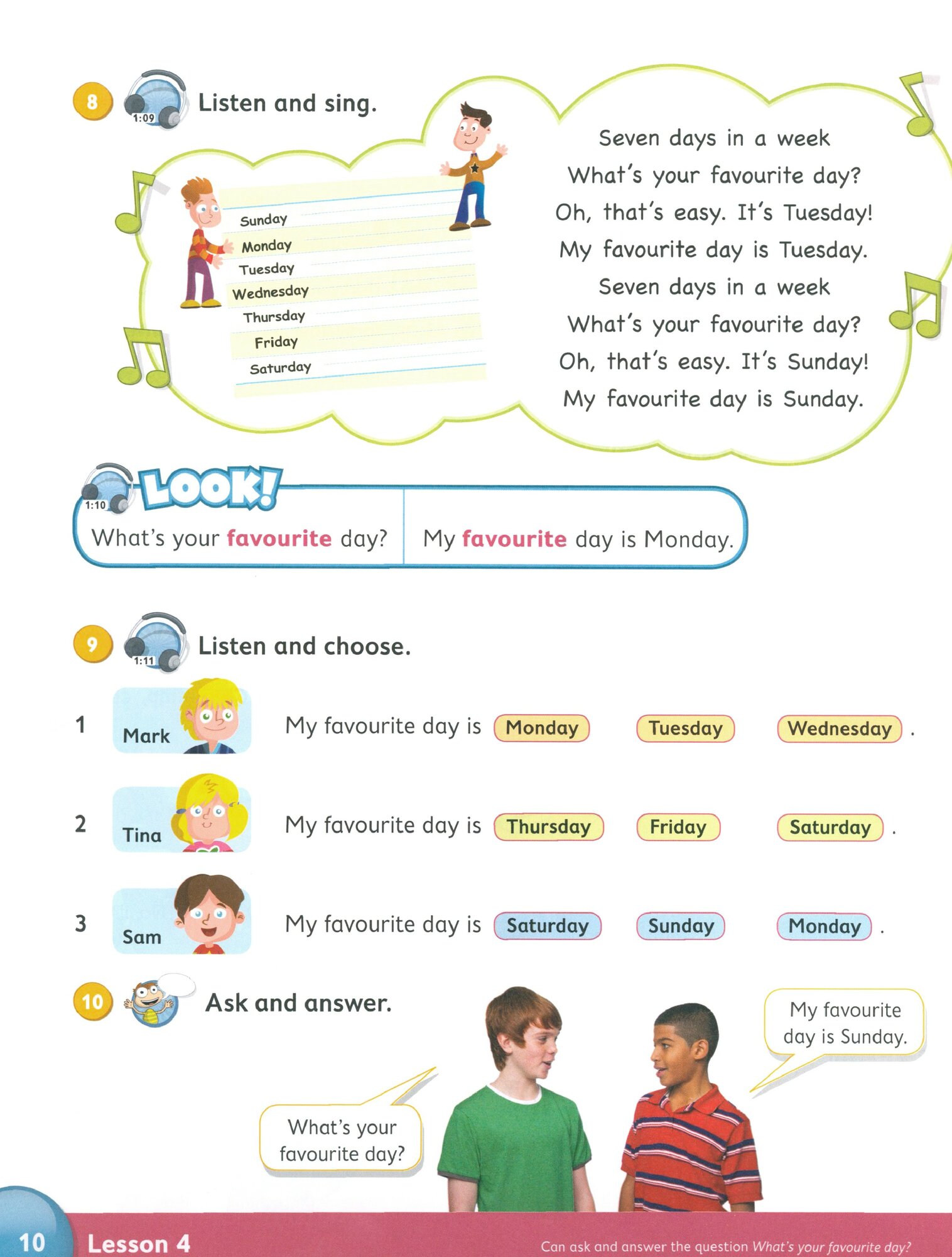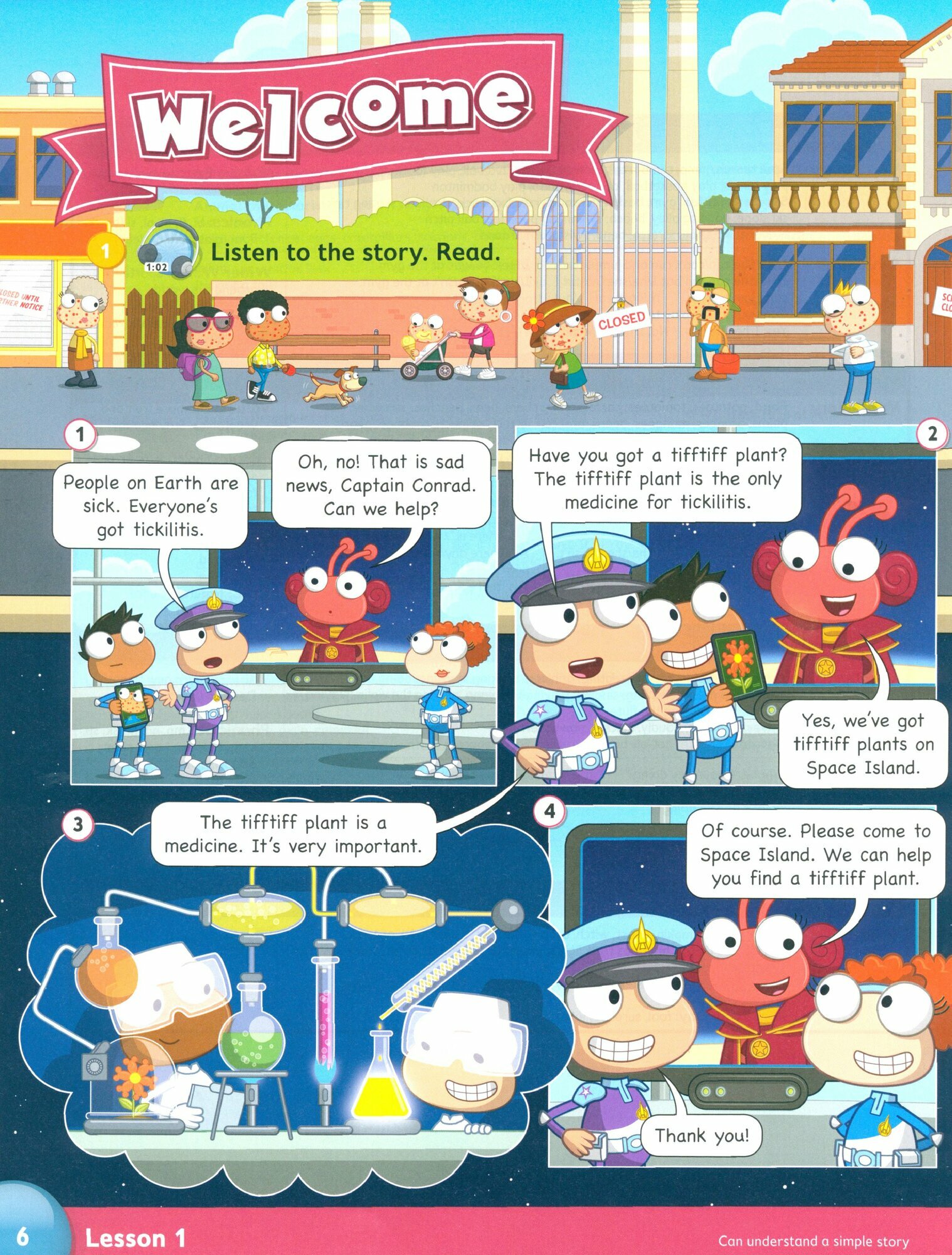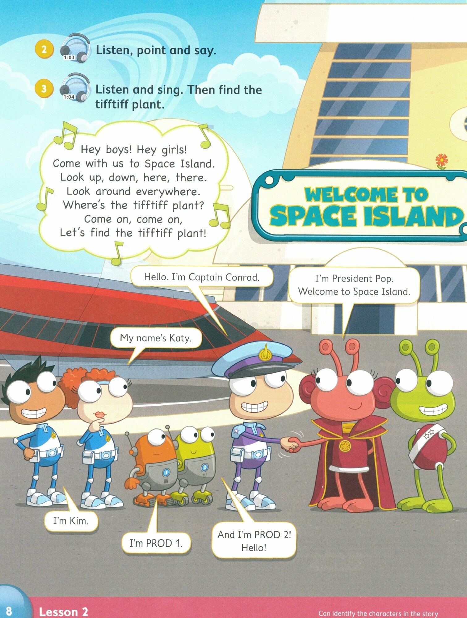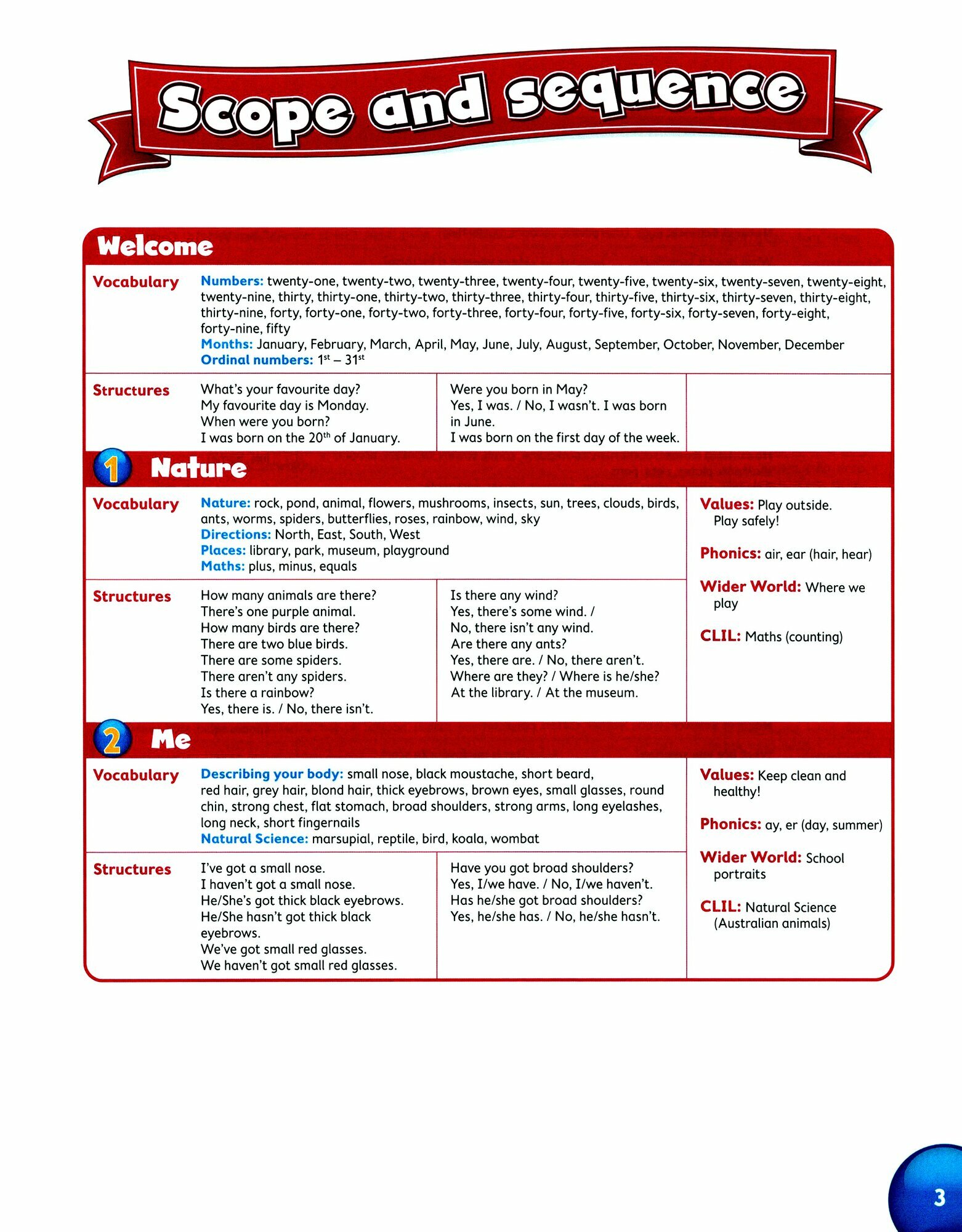 Учебник содержит вступительный блок из шести уроков, который знакомит учеников с персонажами, живущими на отдельном острове. 8 разделов, каждый из которых разделен на 10 отдельных уроков. Отдельная работа со словарным запасом и грамматикой. Возможность вырезать и приклеивать наклейки в каждом блоке заданий.