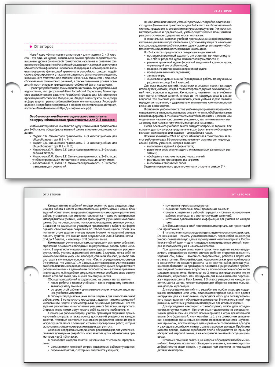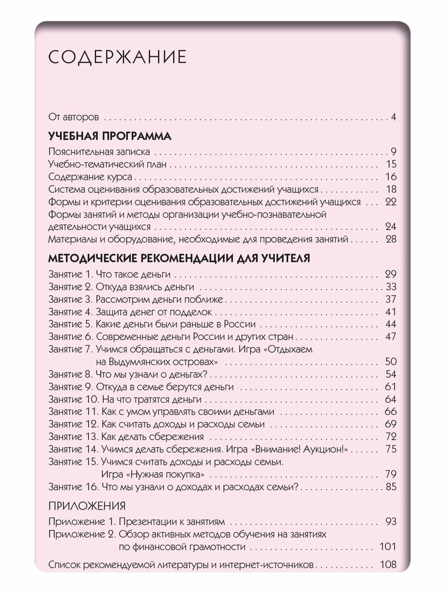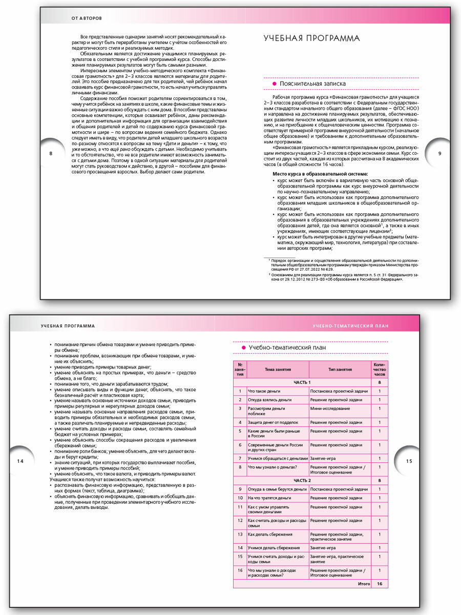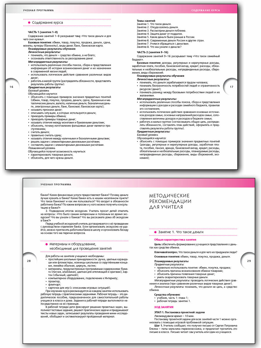 В программе курса "Финансовая грамотность. 2-3 классы" (автор учебника С. Федин) указаны цели и задачи курса, планируемые результаты и система оценивания, приведён учебно-тематический план занятий, описаны формы и методы организации образовательного процесса. Методические рекомендации содержат подробные конспекты занятий. Для каждого занятия определены цель и ключевой вопрос для обсуждения, описана организация учебной деятельности, даны ответы к заданиям в рабочей тетради.