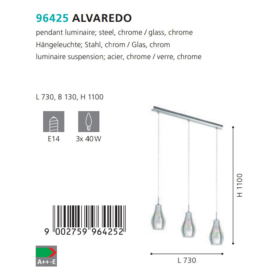Подвесной светильник 96425 из серии «Alvaredo» от производителя Eglo (Австрия). Дизайн-стиль современный. Отлично подойдет для такого типа помещений, как кухня. Цвет товара серебристый. Используемые материалы: металл, стекло. С учетом технических характеристик мощности хватит для освещения 6.6 м2. Дизайн и форма плафона флористика. Цоколь E14. Вид ламп: накаливания. Количество ламп 3 шт. Мощность одной лампы составляет 40 Вт. Общая мощность 120 Вт. Напряжение 230 Вольт. Уровень защищенности от влаги и пыли IP20. Расширенная гарантия на товар 2 года. Длина 730 мм. Ширина 130 мм. Высота 1100 мм. Вес товара 2.746 кг. Комплектация: Подвесной светильник. Инструкция по сборке/использованию. Детали, необходимые для сборки товара.Товар упакован в картонную коробку. В случае доставки транспортными службами или маркетплейсом добавляются дополнительные элементы упаковки для защиты от повреждений при транспортировке - усиление картоном, внутренний наполнитель, стрейч-пленка.