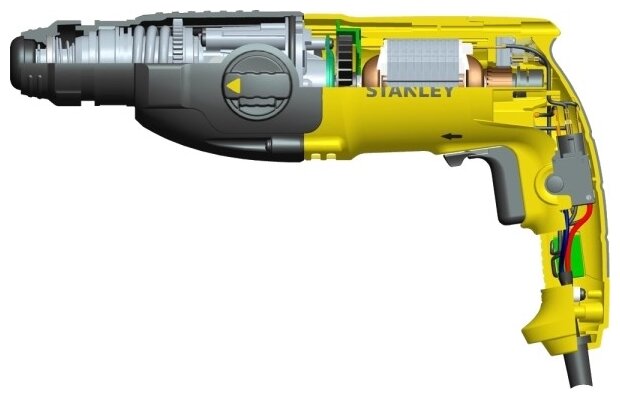 Перфоратор STANLEY STHR263K применяется для сверления отверстий в бетоне и кирпиче диаметром до 26 мм. Мощность - 800 Вт. Три режима работы: сверление, удар+сверление, удар. Может использоваться при демонтажных работах (скалывание плитки). Патрон - SDS-Plus.