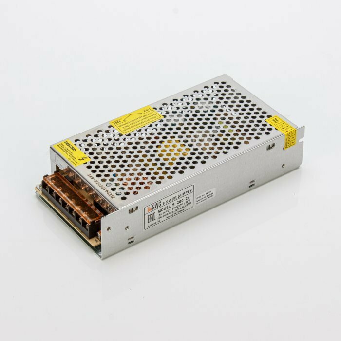 Блок питания SWG S-200-24 24В, 200Вт, IP20, 8,3А, металл предназначен для преобразования переменного сетевого напряжения 220VAC в постоянное стабилизированное напряжение. Отлично подходит для питания маломощных светодиодных лент и модулей, а также другого оборудования небольшой мощности, требующего постоянное стабилизированное напряжение питания. Блок питания изготовлен на основе печатной платы с электронными компонентами, помещенной в металлический перфорированный корпус.