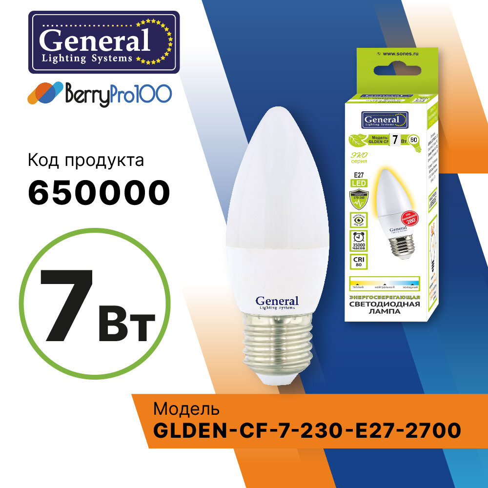 На сегодняшний день товар «Светодиодная лампа GLDEN-CF-7-230-E27-2700 General 650000» можно купить с кешбеком в 1 магазине: Яндекс.Маркет