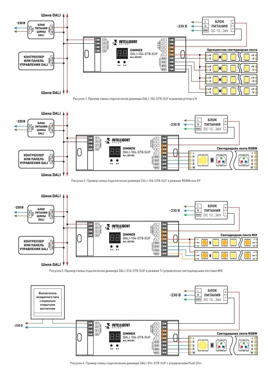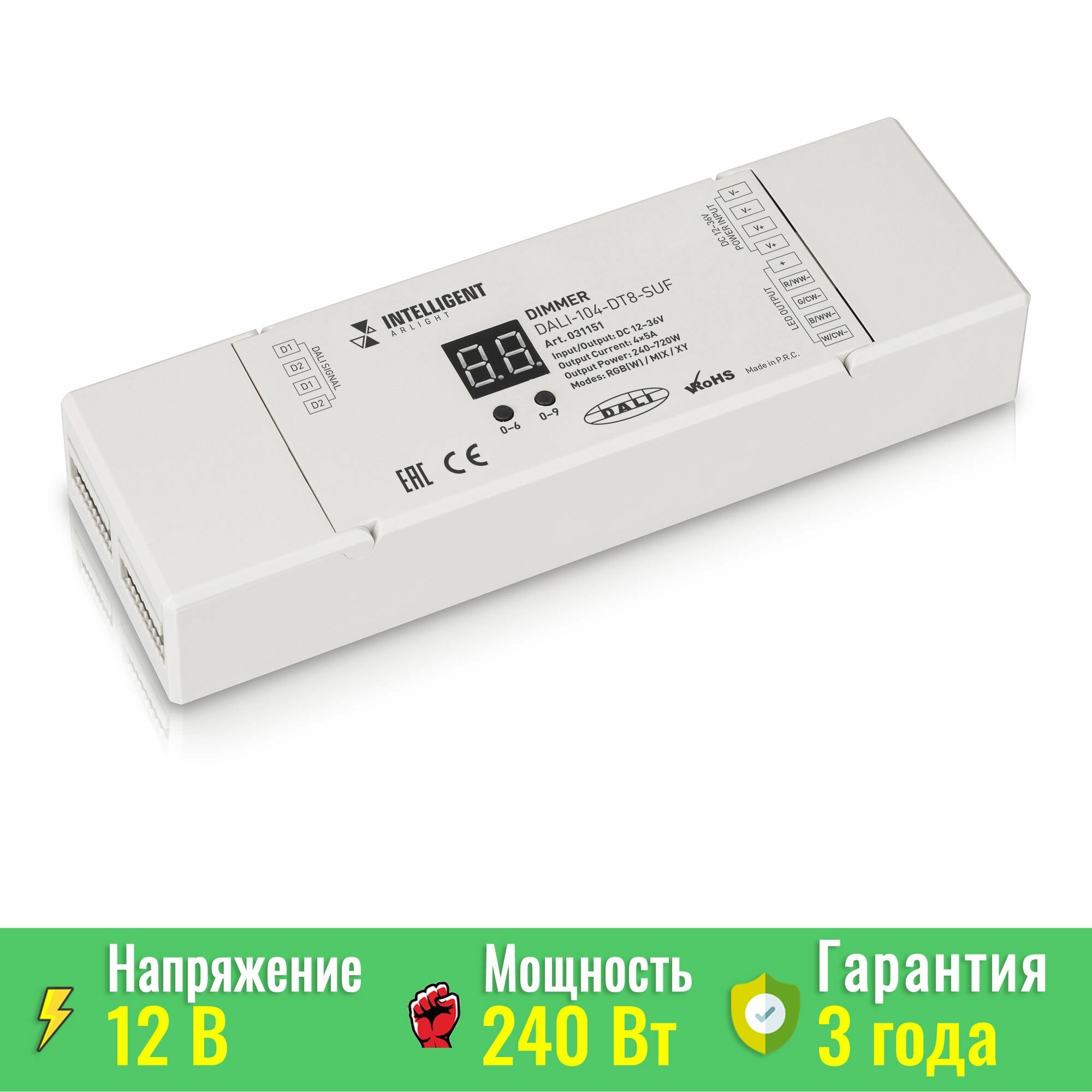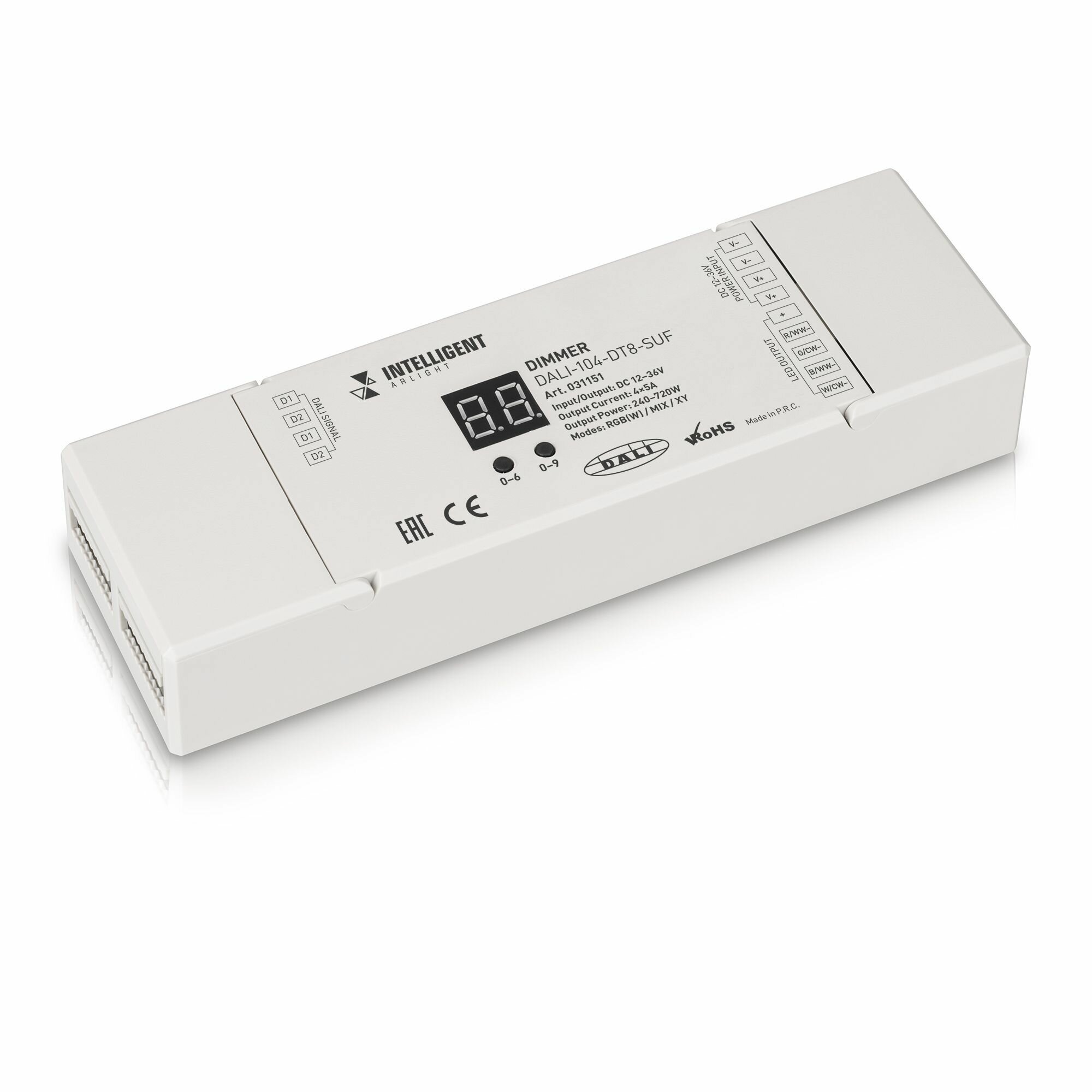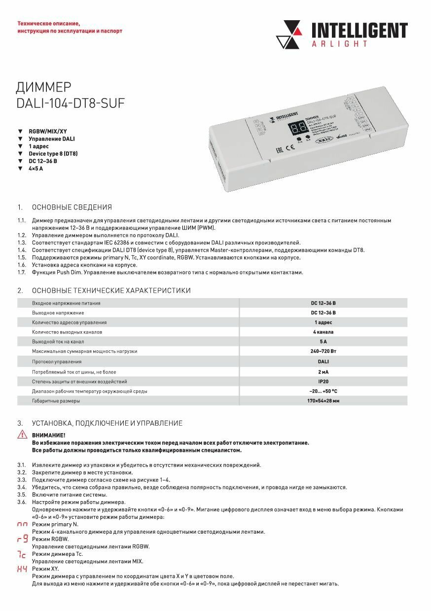 Диммер DALI (DT6) для RGBW светодиодных лент. 4 адреса устройства, 4 канала управления. Питание/выход DC 12-24V, ток нагрузки 4x5A, максимальная суммарная мощность нагрузки 240-480W. На корпусе цифровой дисплей. Габариты 110х67х48 мм. Цвет корпуса белый. Для использования на DIN-рейке.