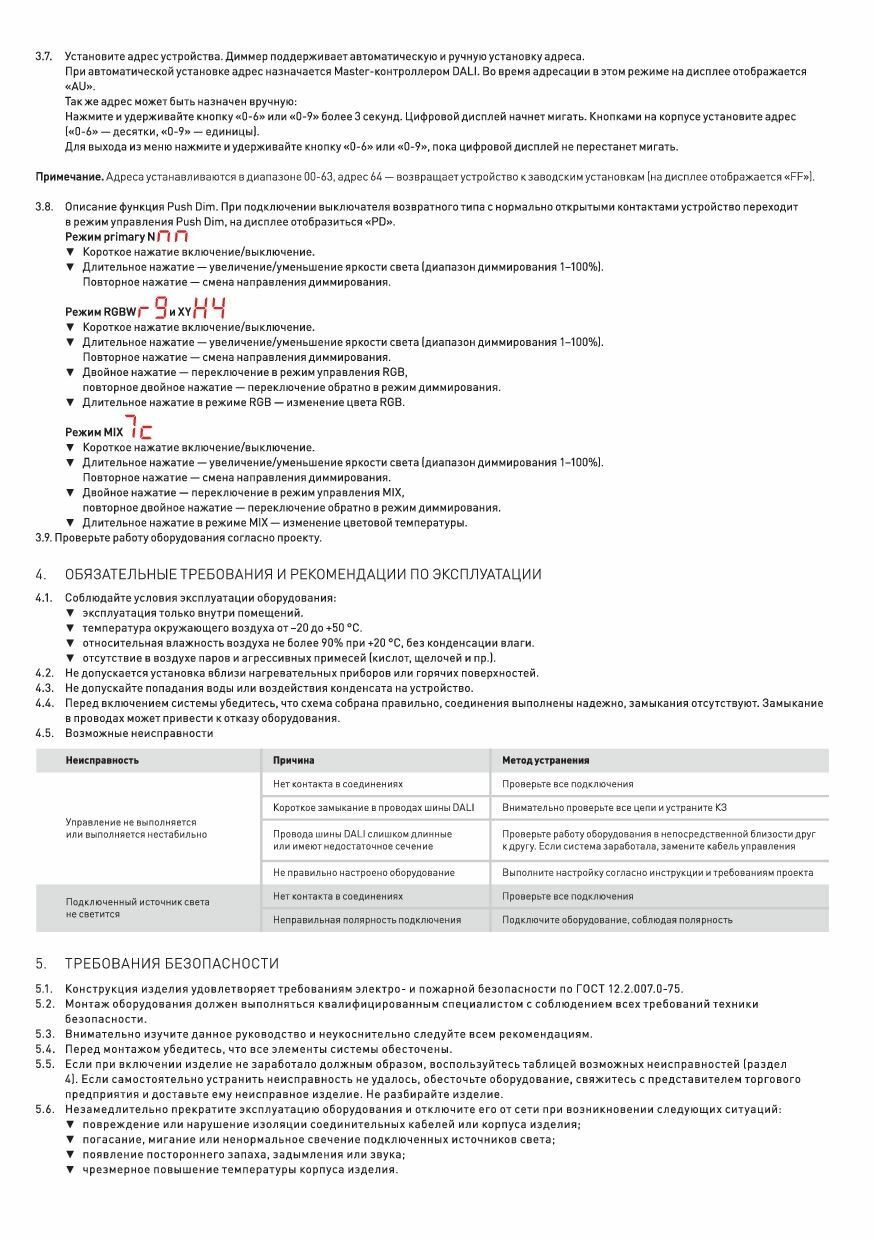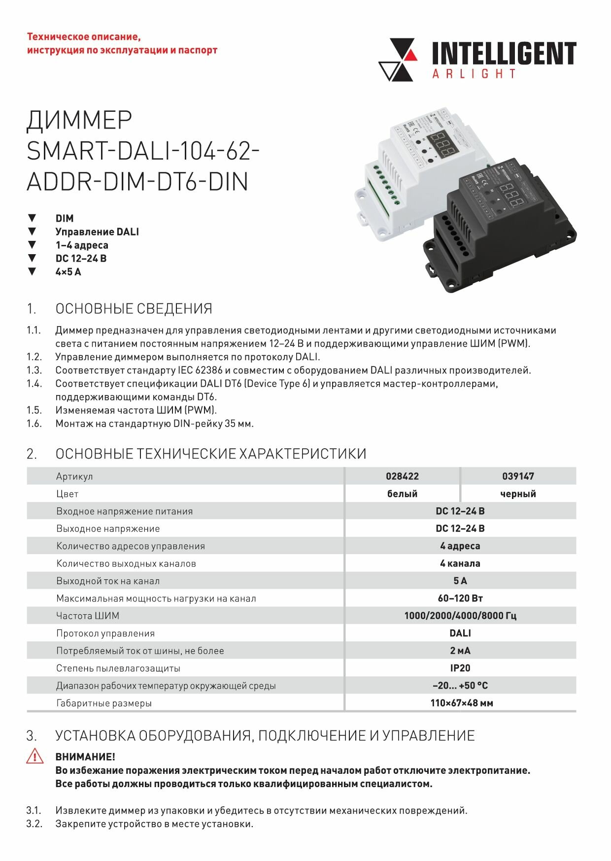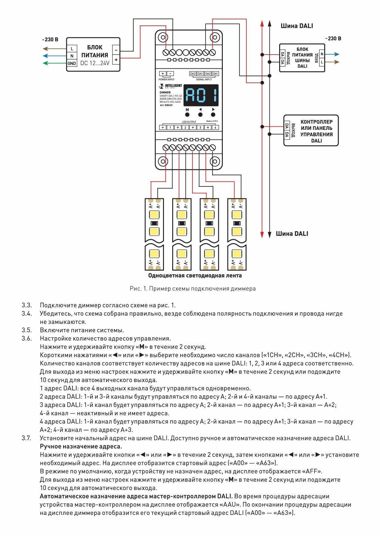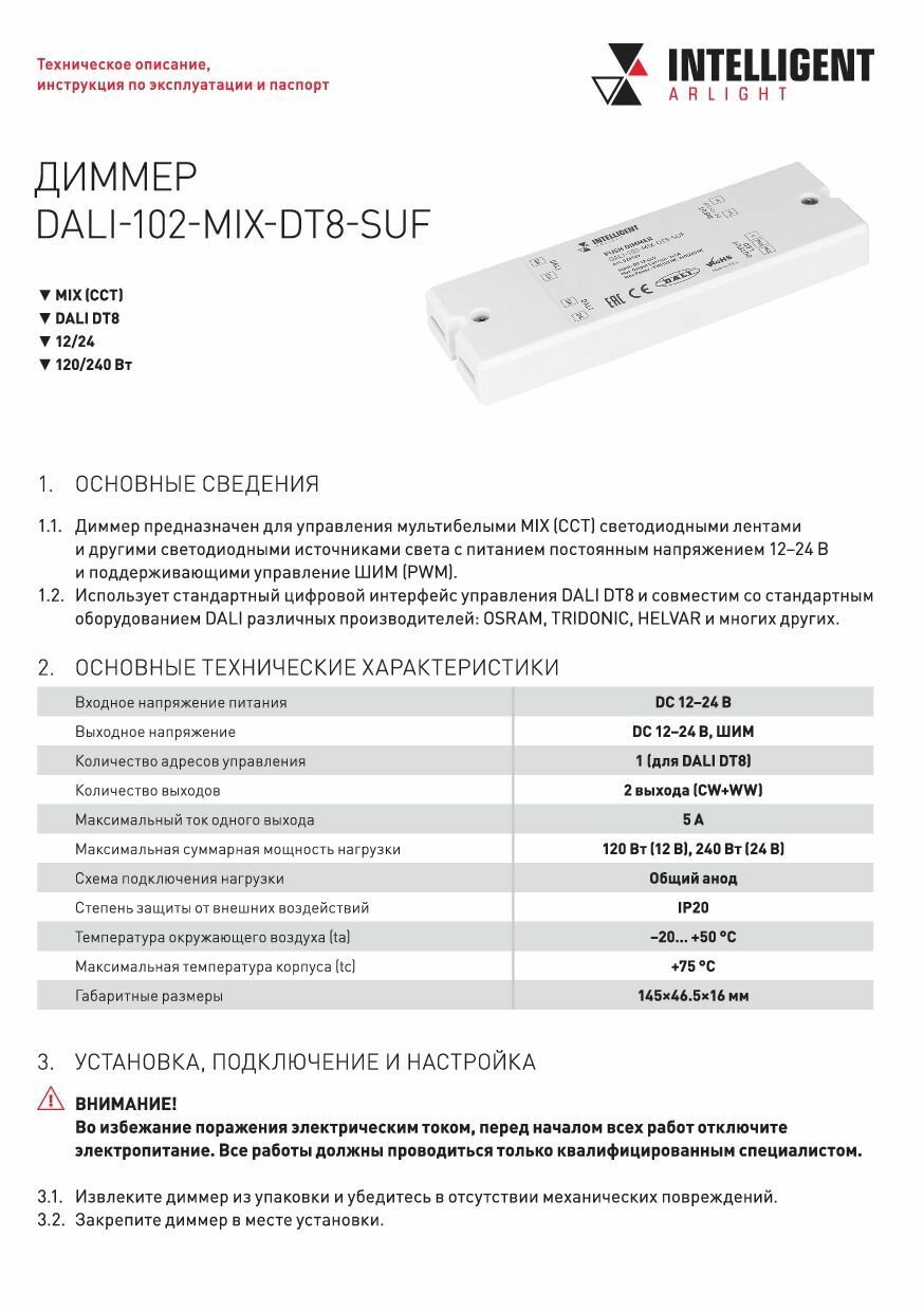 Диммер DALI (DT6) для RGBW светодиодных лент. 4 адреса устройства, 4 канала управления. Питание/выход DC 12-24V, ток нагрузки 4x5A, максимальная суммарная мощность нагрузки 240-480W. На корпусе цифровой дисплей. Габариты 110х67х48 мм. Цвет корпуса белый. Для использования на DIN-рейке.