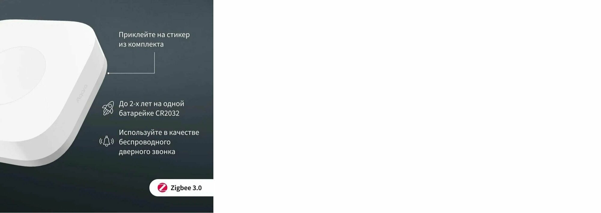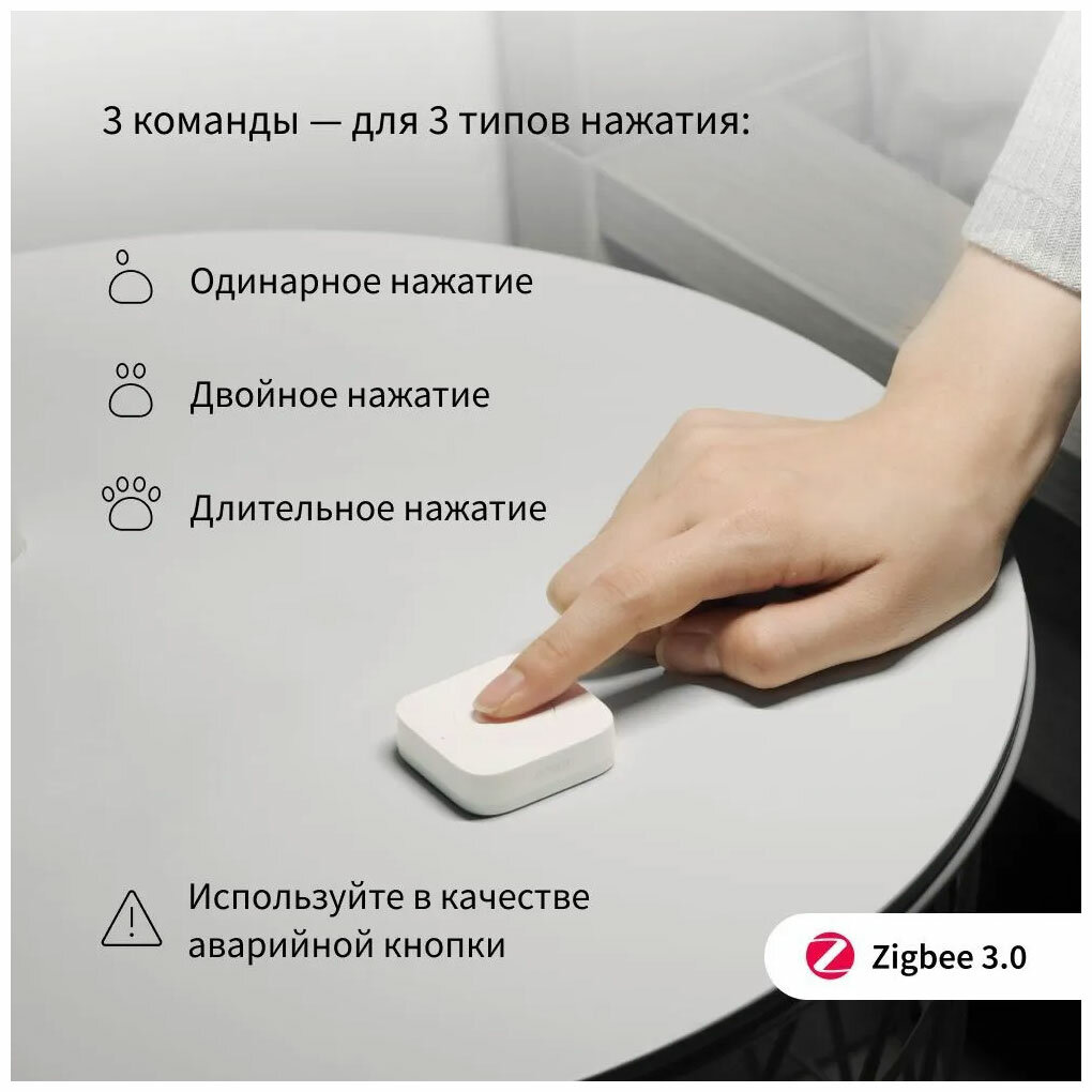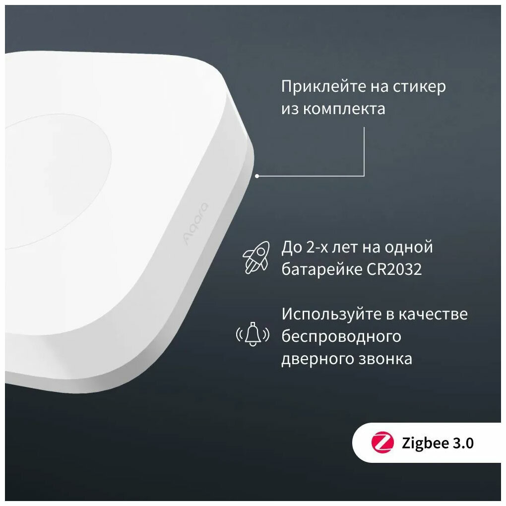 Беспроводной мини-выключатель Aqara Wireless mini switch WB-R02DУправляйте светом, шторами и другими устройствами Умного дома через мини-кнопку Aqara. Положите около кровати и выключайте люстру, не вылезая из под одеяла. Или сделайте умный звонок — повесьте кнопку около двери и установите беззвучный режим на ночь, чтобы вас не беспокоили.ОсобенностиУ обновлённой версии с протоколом Zigbee 3.0 есть ряд преимуществ: она более энергоэффективная, то есть устройство проработает более 2-х лет на одной батарее, и быстрее по скорости отклика, чем предыдущая версия мини-кнопки.По размеру кнопка такого же осталась компактного размера и с тремя типами нажатия — одинарным, двойным и длительным.Как работаетНа каждое из трёх нажатий можно установить определённое действие. Когда вы нажмёте на кнопку, она передаст сигнал на Хаб, а он, в свою очередь, другому устройству. Например:одинарное нажатие будет включать и выключать лампу около кровати;двойное нажатие приглушит свет от люстры;длительное нажатие закроет шторы.ПитаниеРаботает на одной батарее CR2032 до двух лет. Когда батарея начнёт разряжаться, вам придёт уведомление на смартфон.Протокол связи и совместимостьДля работы датчика используется версия протокола Zigbee 3.0.АвтоматизацииВыключайте всё из кровати. Перед сном выключите одинарным нажатием свет, двойным — закройте шторы, а длительным — включите увлажнитель (для этого понадобится Хаб M2 или Камера Хаб G3).Умный дверной звонок. Пусть при коротком нажатии кнопка будет выполнять роль обычного звонка, а при двойном — включит свет в коридоре, когда вы заходите домой.Почему нужен Центр умного дома (хаб)?Центр умного дома выполняет роль моста между устройствами Aqara и Wi-Fi роутером. Аксессуары Aqara подключаются по протоколу Zigbee, который разработан специально для Умного дома.