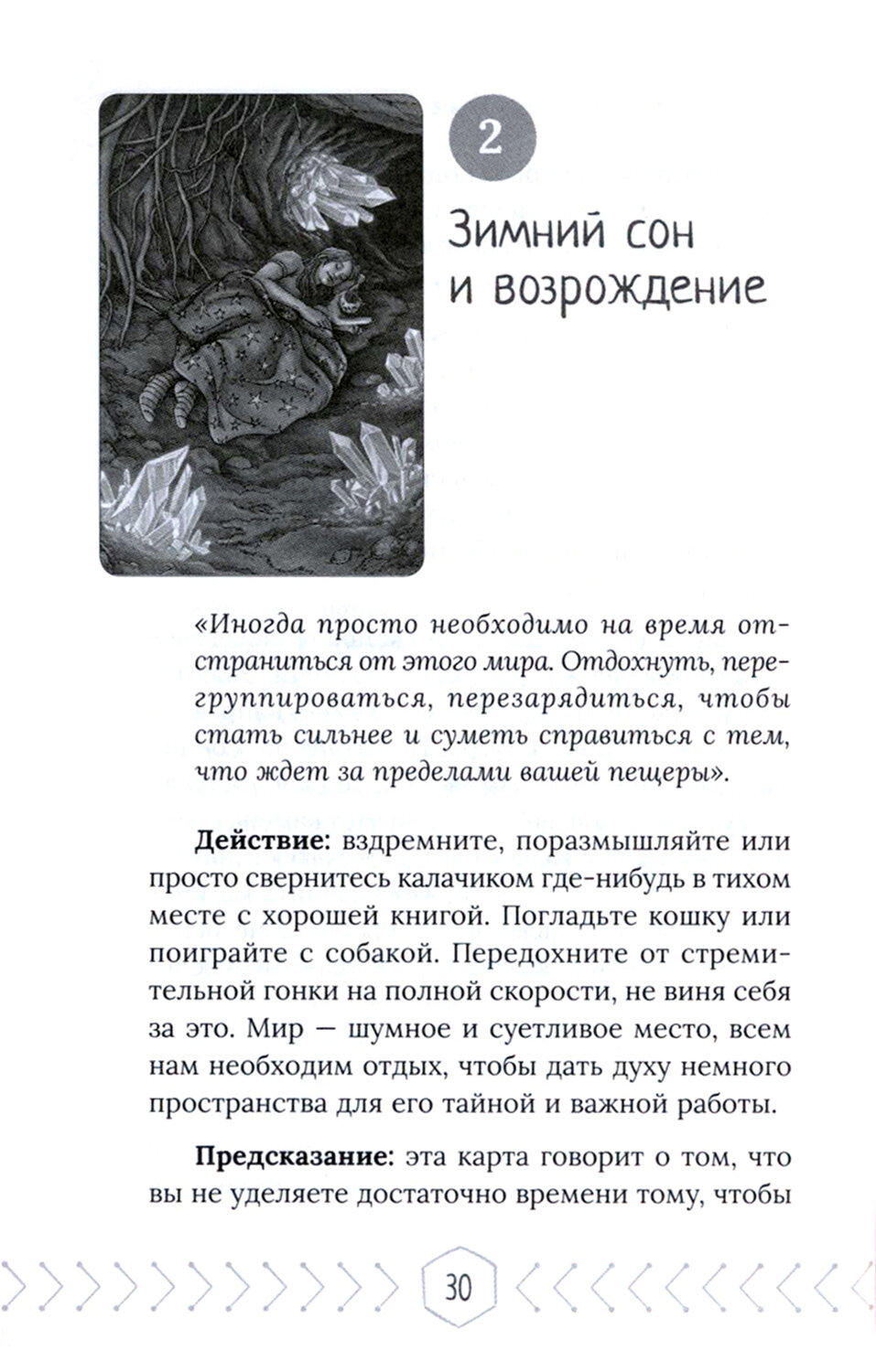 В брошюре описаны три способа применения каждой конкретной карты (действие, предсказание, магия), но не бойтесь придумывать собственные интерпретации или методы использования колоды. Рассматривайте книгу как отправную точку для вашего путешествия.