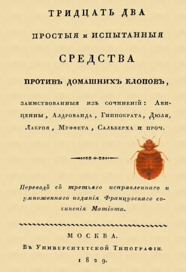 Репринт с издания. Москва, 1829. Полное название: Тридцать два простые и испытанные средства против домашних клопов, заимствованные из сочинений: Авиценны, Алдрованда, Гиппократа, Дюля, Лакроя, Муффета, Сальберха и проч. Пер. с 3-го испр. и умноженного изд. фр. соч. Матиота.