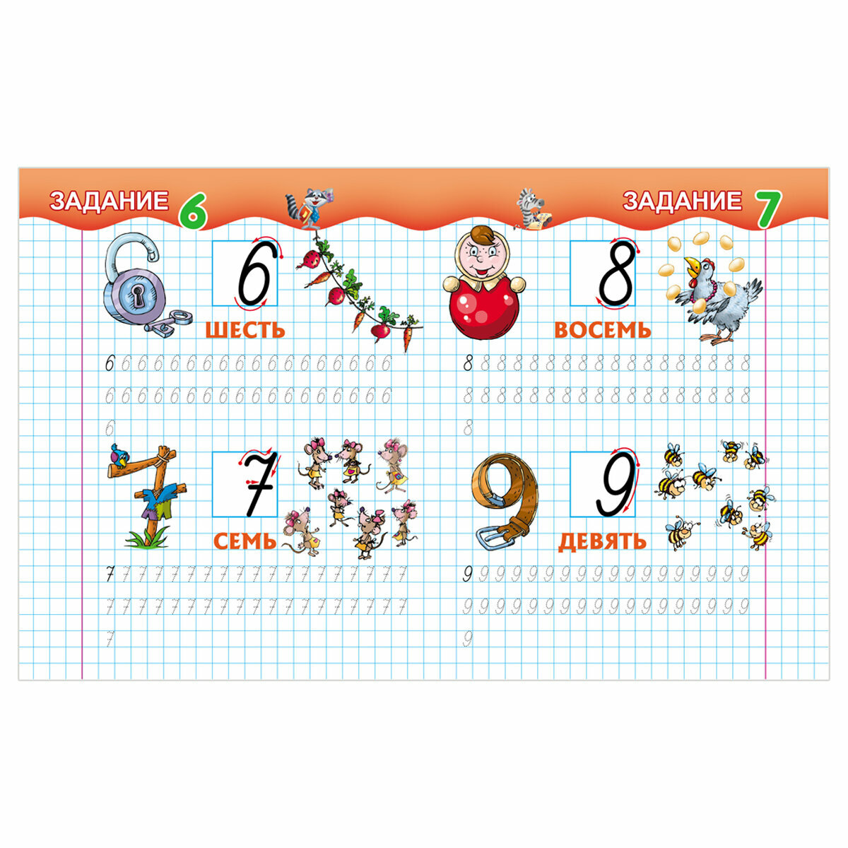 Эти прописи помогут ребёнку в игровой форме развить зрительное восприятие, внимание, мелкую моторику и координацию движения руки. Чтобы малыш не уставал, прописи разделены на отдельные задания, не перегружены упражнениями, графические элементы даны в увеличенном виде. Каждой цифре соответствуют забавные рисунки для её наглядного восприятия и количественного выражения, способствующие закреплению знаний.