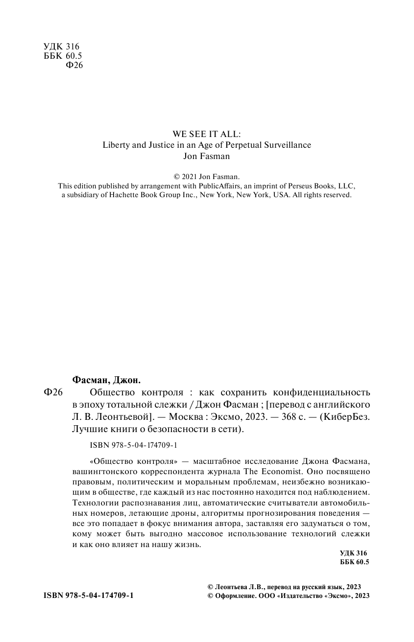 Общество контроля. Как сохранить конфиденциальность в эпоху тотальной слежки (Фасман Джон); ООО "Издательство "Эксмо", 2023