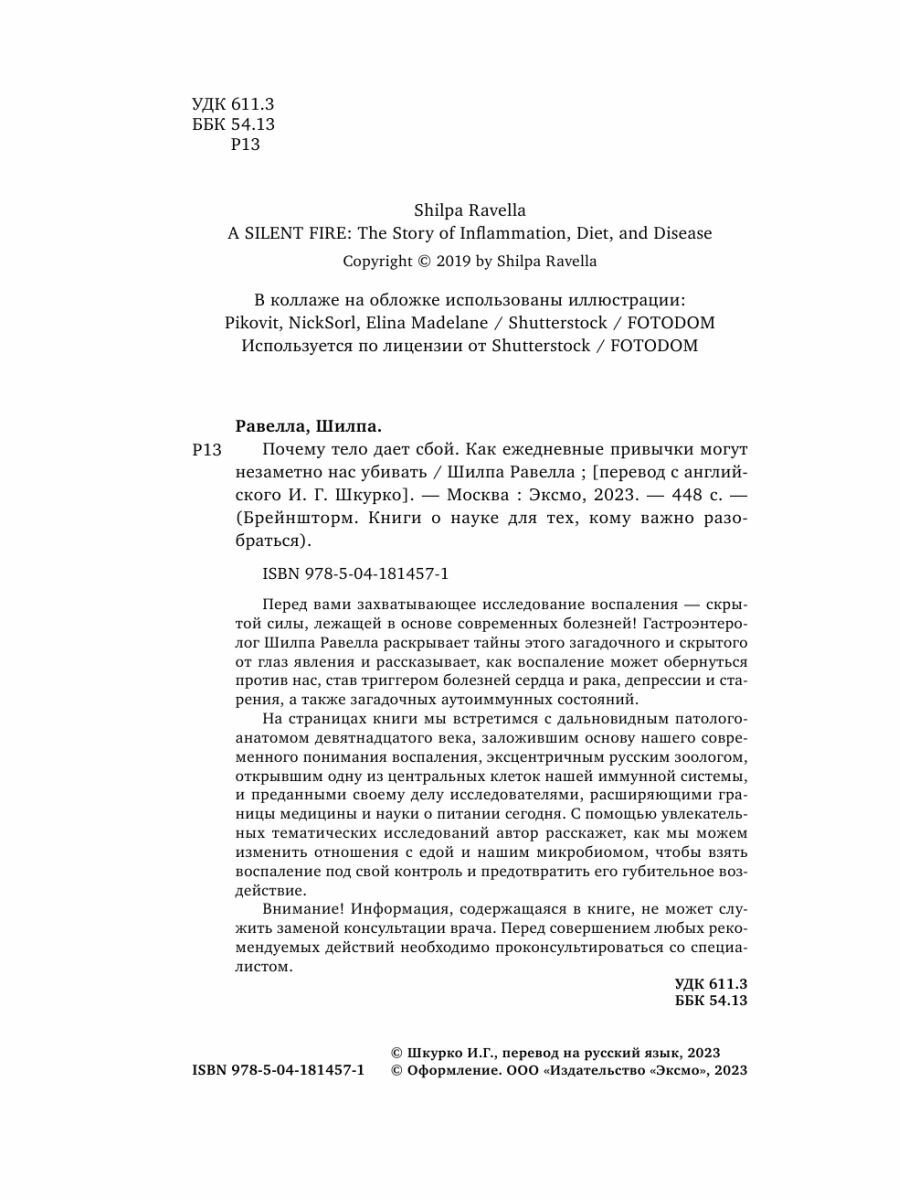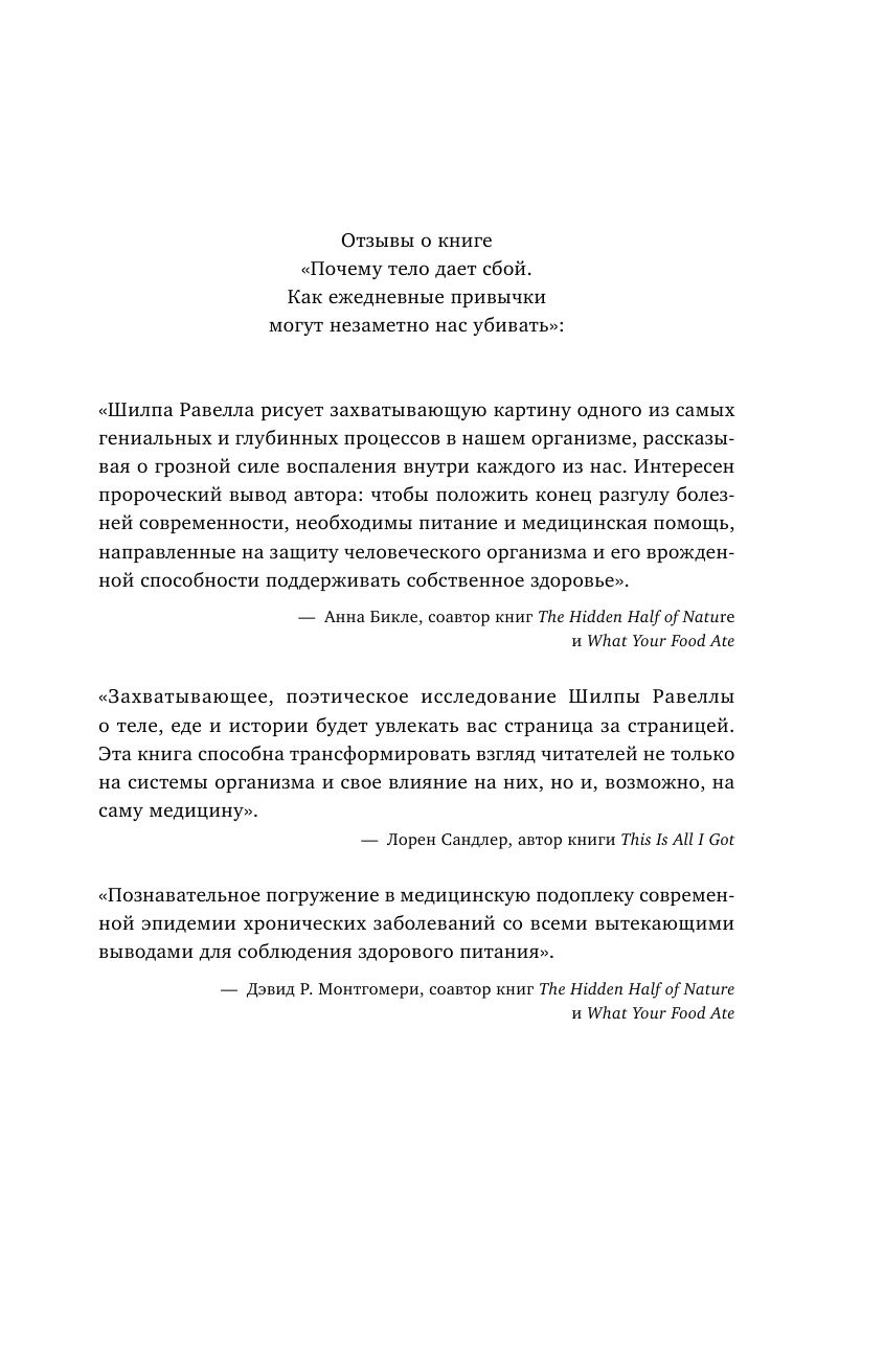 Перед вами захватывающее исследование воспаления — скрытой силы, лежащей в основе современных болезней! Гастроэнтеролог Шилпа Равелла раскрывает тайны этого загадочного и скрытого от глаз явления и рассказывает, как воспаление может обернуться против нас, став триггером болезней сердца и рака, депрессии и старения, а также загадочных аутоиммунных состояний.На страницах книги мы встретимся с дальновидным патологоанатомом девятнадцатого века, заложившим основу нашего современного понимания воспаления, эксцентричным русским зоологом, открывшим одну из центральных клеток нашей иммунной системы, и преданными своему делу исследователями, расширяющими границы медицины и науки о питании сегодня. С помощью увлекательных тематических исследований автор расскажет, как мы можем изменить отношения с едой и нашим микробиомом, чтобы взять воспаление под свой контроль и предотвратить его губительное воздействие.