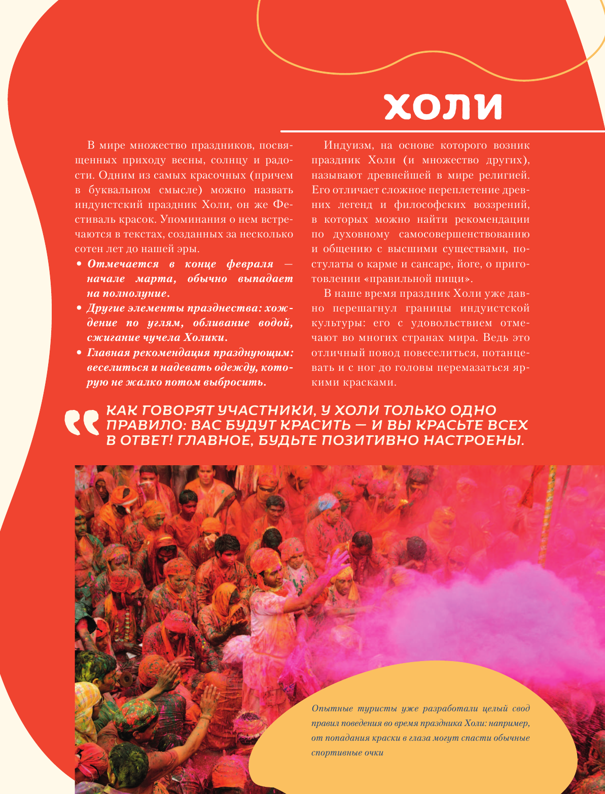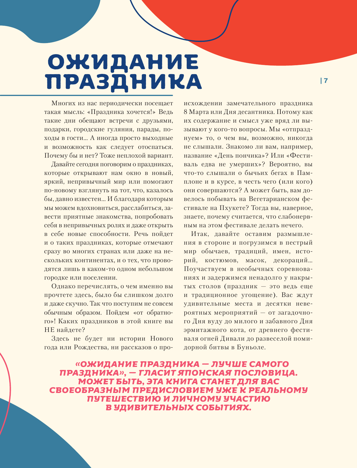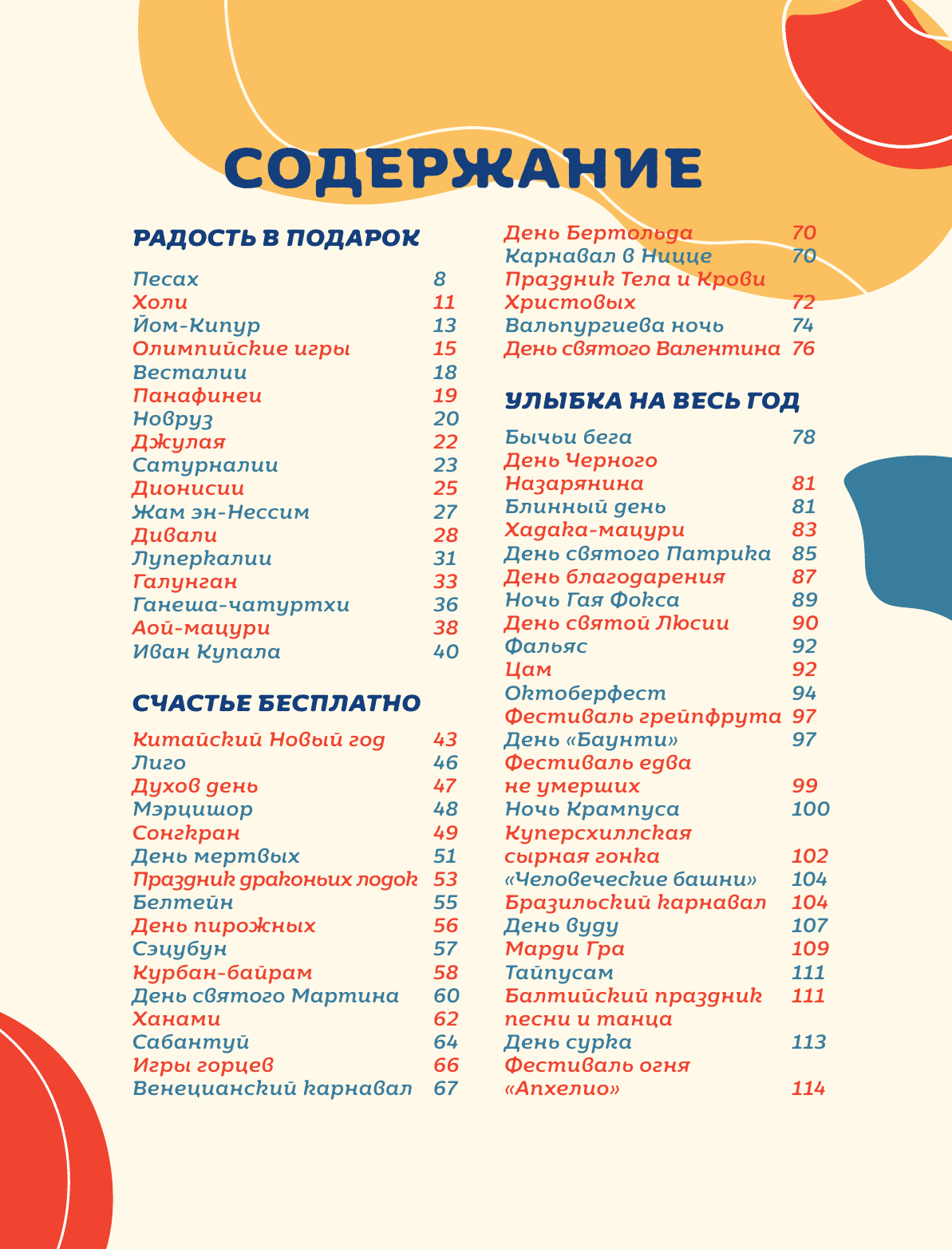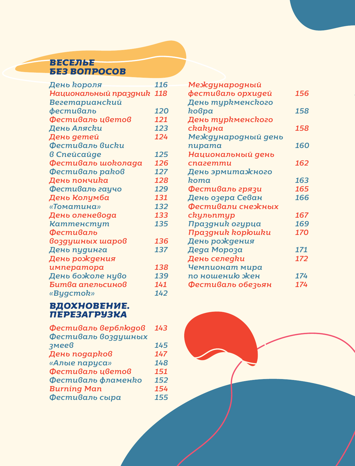 Эта яркая иллюстрированная энциклопедия проведет вас по самым необычным, странным, экзотическим праздничным событиям, которые отмечают сразу во многих странах или на нескольких континентах, и о тех, что проводятся лишь в каком-то одном небольшом городке или поселении. Вы побываете на «Дне пончика» и на «Фестивале едва не умерших», узнаете о бычьих бегах в Памплоне и о том, в честь чего (или кого) они совершаются. Вас ждут удивительные места и десятки невероятных мероприятий — от загадочного Дня вуду до милого и забавного Дня эрмитажного кота, от древнего фестиваля огней Дивали до развеселой помидорной битвы в Буньоле.