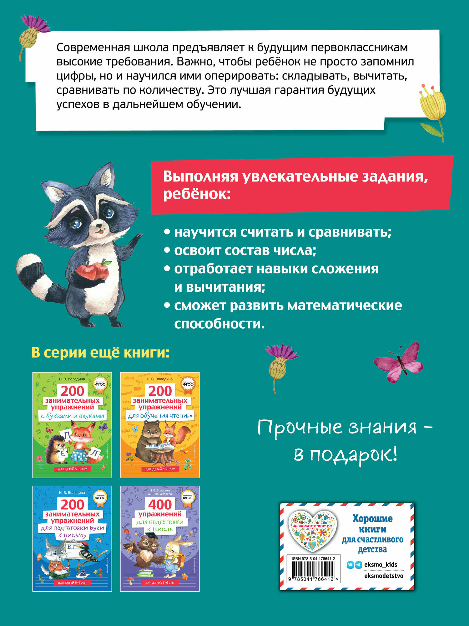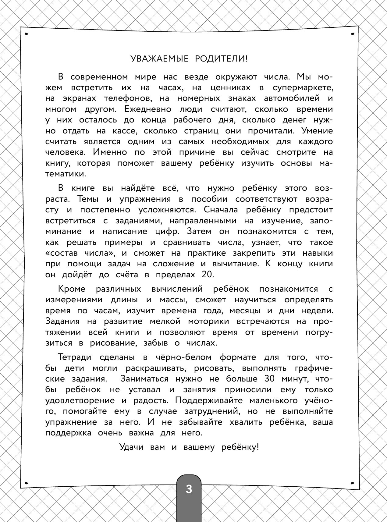 Книга большого формата со стильными черно-белыми иллюстрациями, напечатанная на белой бумаге представляет собой одновременно рабочую тетрадь и обучающее пособие для подготовки ребенка школе. 200 увлекательных и понятных упражнений помогут детям запомнить цифры и научиться складывать и вычитать, сравнивать и обобщать. Эффективная методика проверена временем и гарантирует высокий результат. А оптимальное сочетание цены и качества порадует родителей и педагогов.