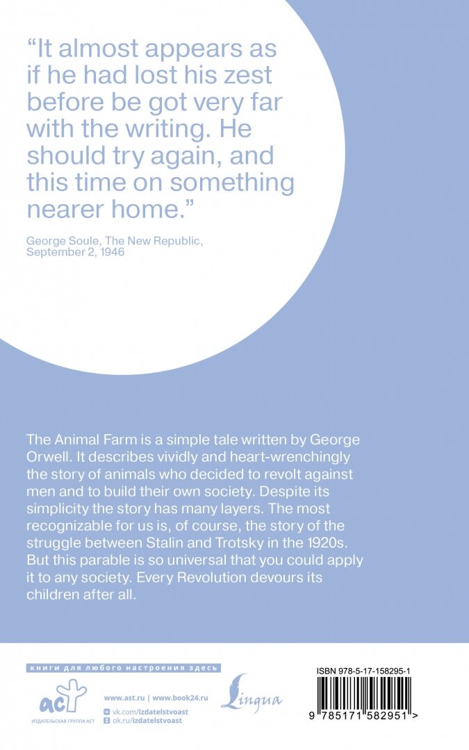 На сегодняшний день товар «Книга: Animal farm / Скотный двор (Джордж Оруэлл); Издательство АСТ, 1943-1944» можно купить с кешбеком в 5 магазинах: book24, ЛитРес, Буквоед, Яндекс.Маркет, Читай-город