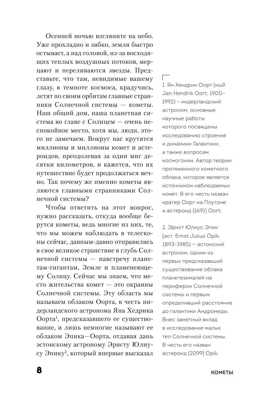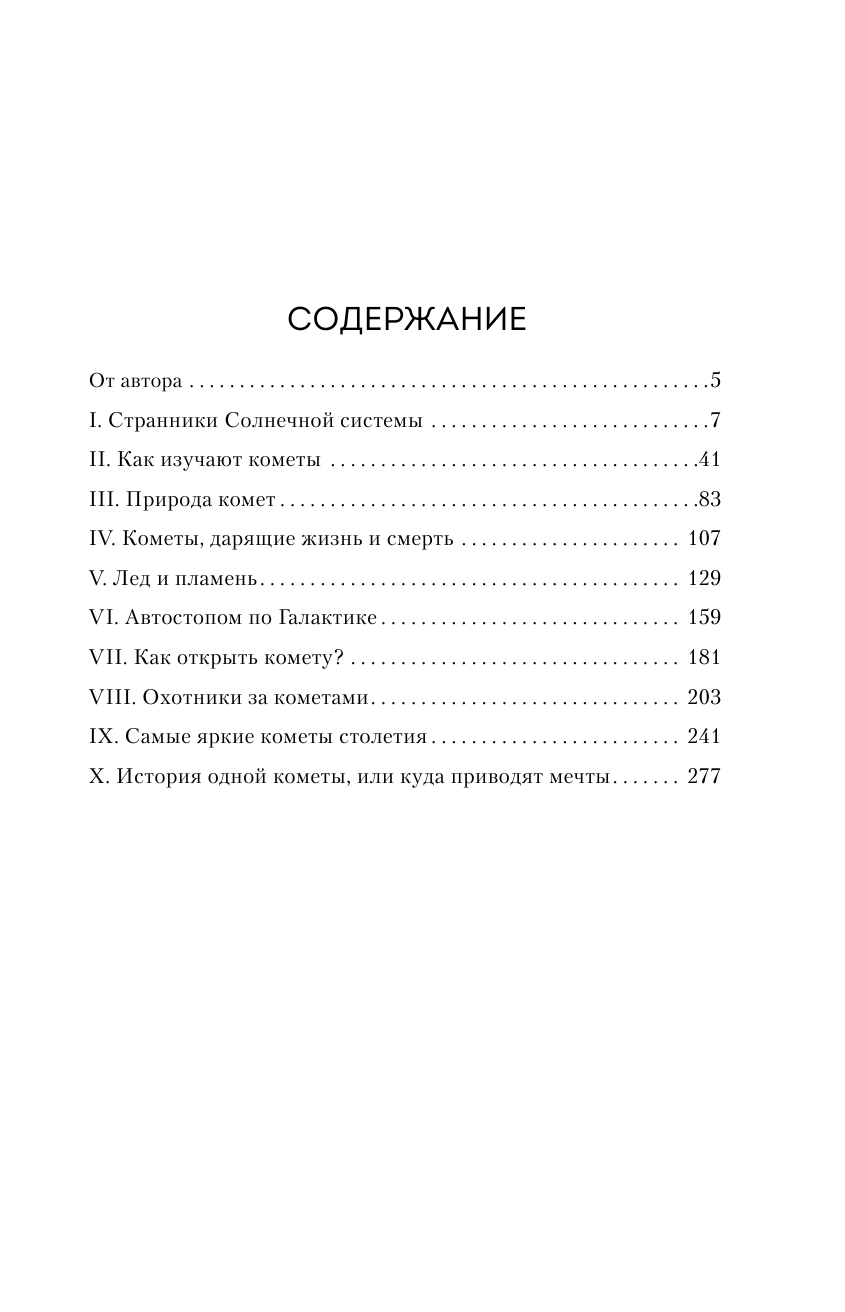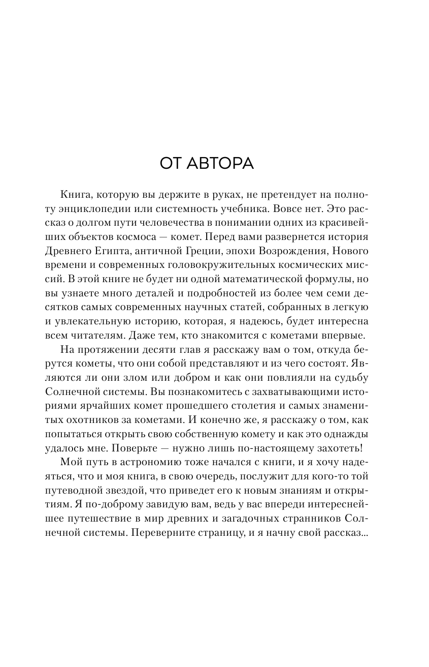 От автора к читателю: «Книга, которую вы держите в руках, не претендует на полноту энциклопедии или системность учебника. Вовсе нет. Это рассказ о долгом пути человечества в понимании одних из красивейших объектов Космоса — комет. Перед вами развернется история Древнего Египта, античной Греции, эпохи Возрождения, Нового времени и современных головокружительных космических миссий. В этой книге не будет ни одной математической формулы, но вы узнаете много деталей и подробностей из более чем семи десятков самых современных научных статей, собранных в легкую и увлекательную историю, которая, я надеюсь, будет интересна всем читателям. Даже тем, кто знакомится с кометами впервые».
