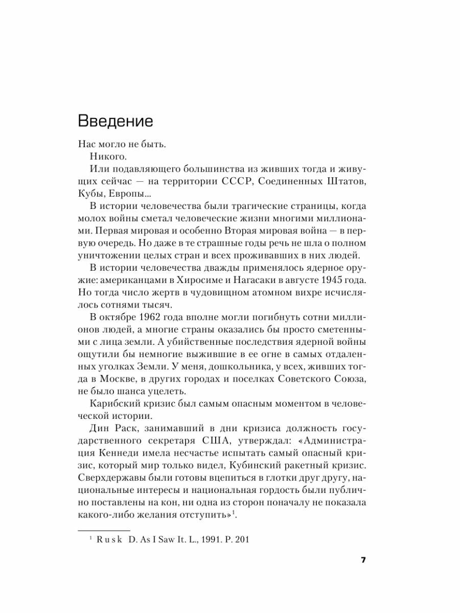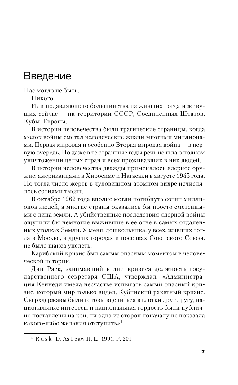 В октябре 1962 года вполне могли погибнуть сотни миллионов людей, а многие страны оказались бы просто сметенными с лица земли. Убийственные последствия ядерной войны ощутили бы немногие выжившие в ее огне в самых отдаленных уголках Земли. У меня, дошкольника, у всех, живших тогда в Москве, в других городах и поселках Советского Союза, не было шанса уцелеть.