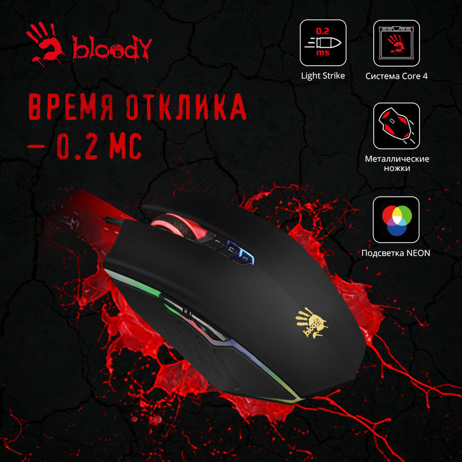 | Особенности | Микропереключатели Light Strike дают молниеносный отклик 0,2 мсек. Метапллические ножки, Инфракрасное колесо прокрутки. 3 режима стрельбы. Активированы уровни Core3.4 в Bloody7 |