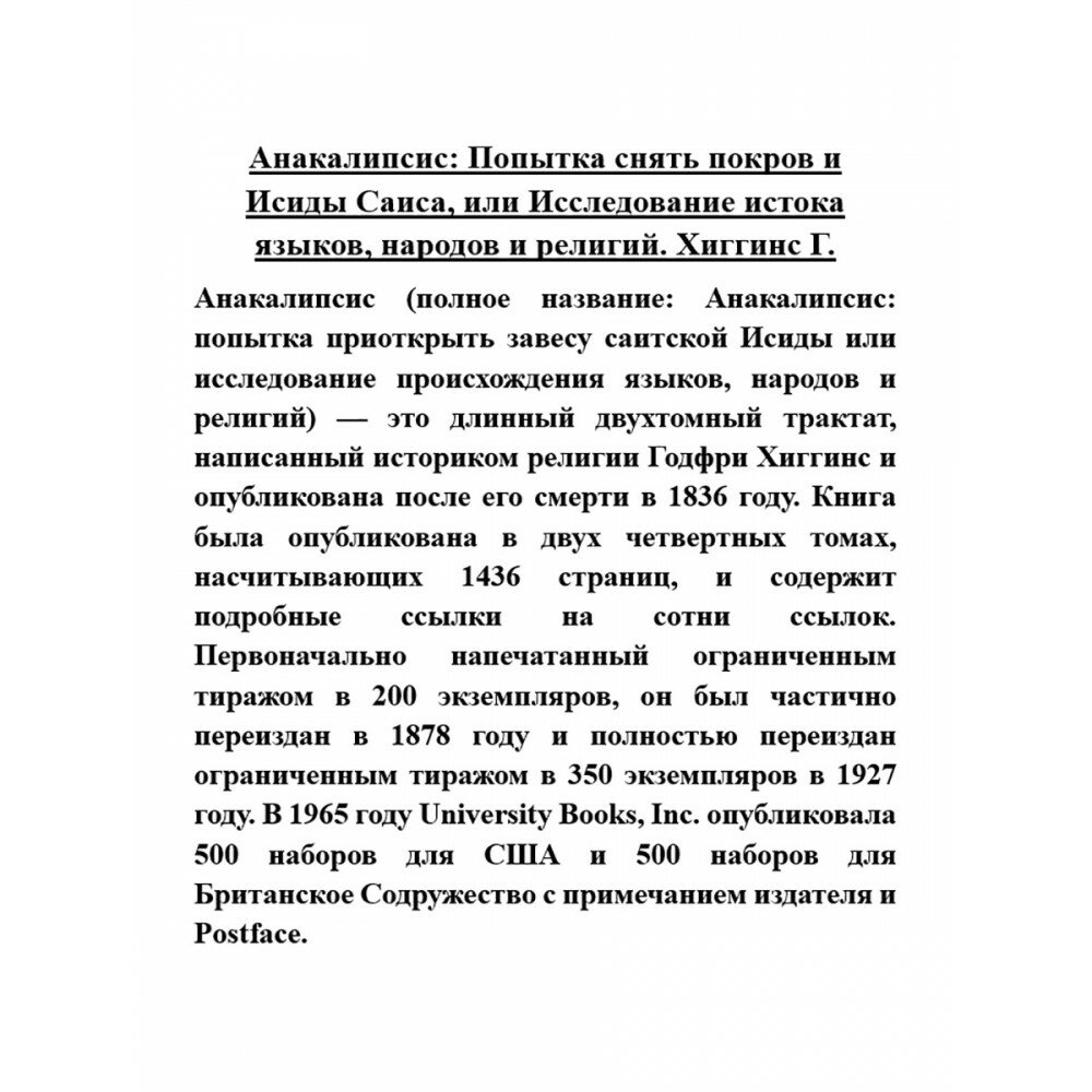Наряду с тем «Анакалипсис» как главная составляющая наследия Хиггинса предоставляет современному читателю, открывающему для себя этого самобытного автора, возможность погрузиться в изучение величайшей тайны происхождения Бога, религий и человека. Настоящее издание состоит из двух частей и повторяет структуру англоязычного издания «Анакалипсиса» 1927 года.