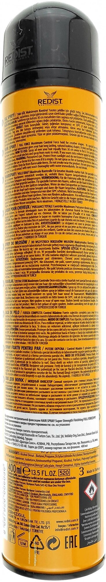 | Полное наименование | Лак для волос REDIST Professional экстрасильной фиксации Hair Spray Super Strength Finishing FULL FORCE, 400 мл |