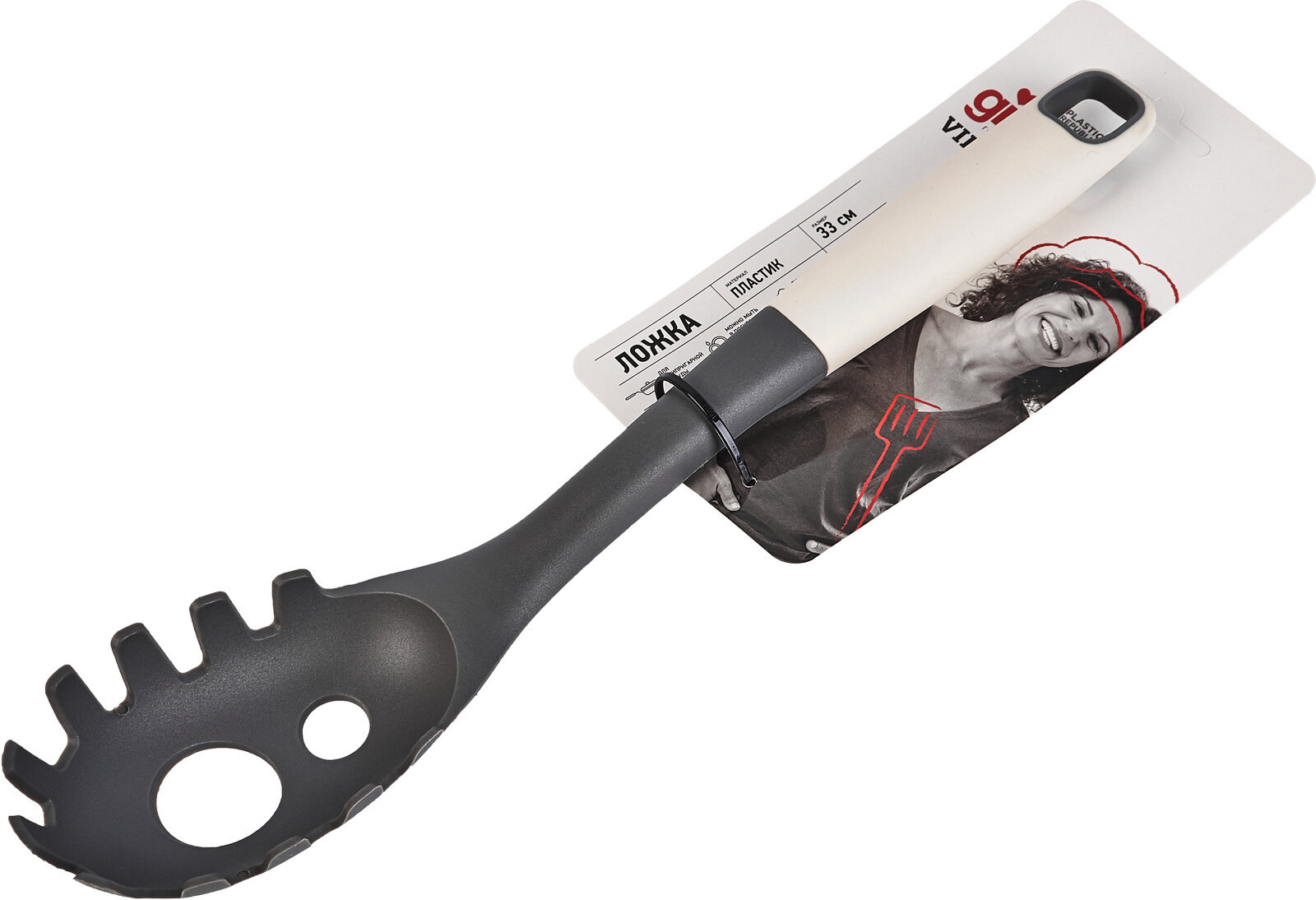 Ложка для спагетти Giaretti коллекции Virtuoso выполнена с учетом оптимального размера рабочей поверхности. Большие зубцы обеспечивают зацеп макаронных изделий, что облегчают процесс приготовления. В центре ложки предусмотрены отверстия для слива лишней жидкости. Мягкая и противоскользящая ручка обеспечивает надежный и удобный хват. На конце ручки отверстие для подвеса прибора на кухне.