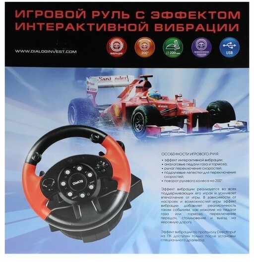 Руль Dialog GW-225VR E-Racer – игровой манипулятор, состоящий из блока педалей и руля. Он позволит сделать процесс игры более динамичным и реалистичным. Руль диаметром 22 см характеризуется углом поворота 200 градусов, функцией виброотдачи и качественной отделкой из прорезиненного нескользящего материала. Подключение посредством порта USB гарантирует широкую совместимость Dialog GW-225VR E-Racer с компьютерами, игровыми консолями и портативными устройствами под управлением операционной системы Android. Крепление на присосках обеспечивает простую и надежную фиксацию устройств на различных поверхностях.