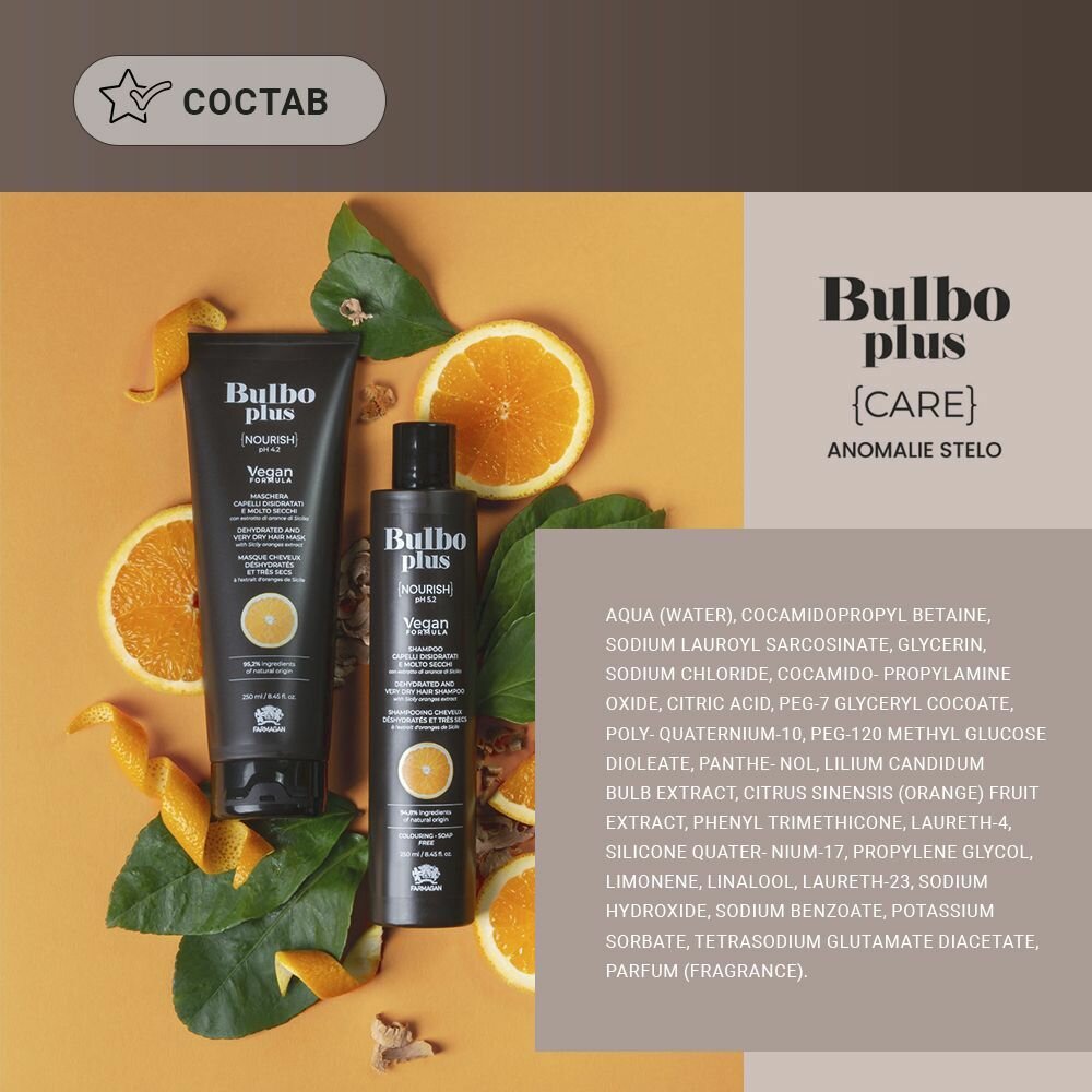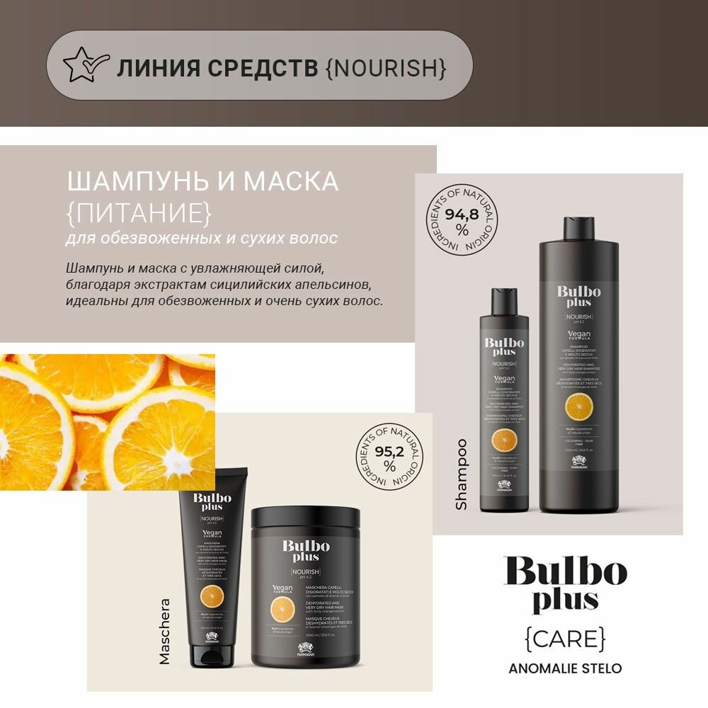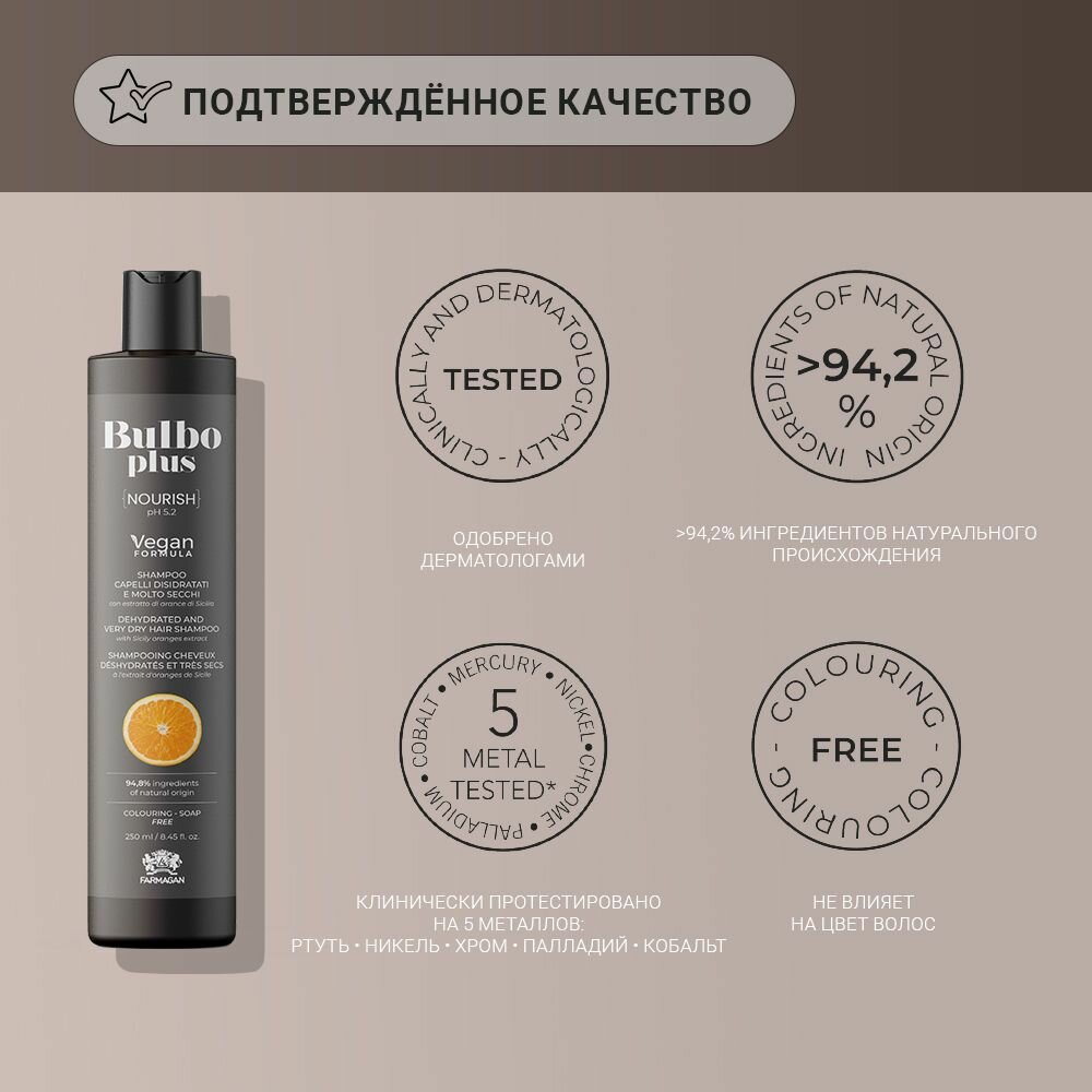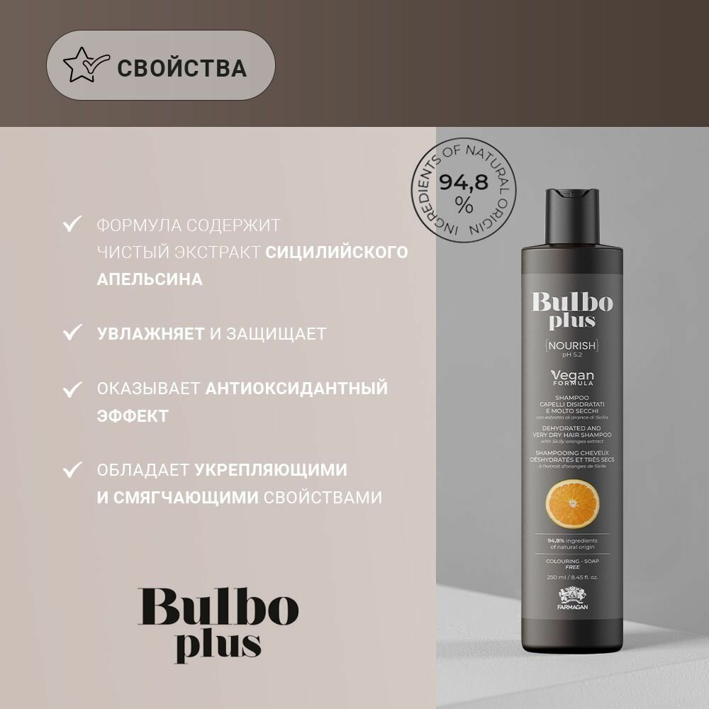 {СИЛА ПРИРОДЫ} Bulbo-это новая профессиональная линия Farmagan, созданная для естественного благополучия волос и кожи головы.Серия Bulbo PLUS-это cкорая помощь для сильно повреждённых волос.Шампунь Питание для обезвоженных и очень сухих волос Farmagan Bulbo Plus {Nourish} интенсивно увлажняет волосяной покров, возвращает естественное сияние и здоровый вид. Предотвращает ломкость, делает волосы послушными. Обладает укрепляющими и кондиционирующими свойствами.Содержит органически и экологически чистый экстракт сицилийских апельсинов с антиоксидантными свойствами, который идеально подходит для обезвоженных и очень сухих волос.Средство на 94,8% состоит из ингредиентов натурального происхождения. Vegan.