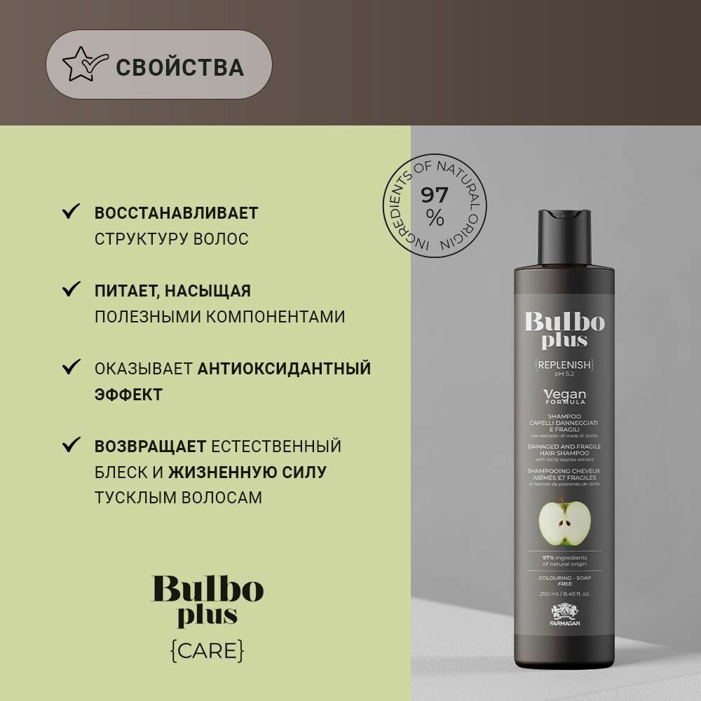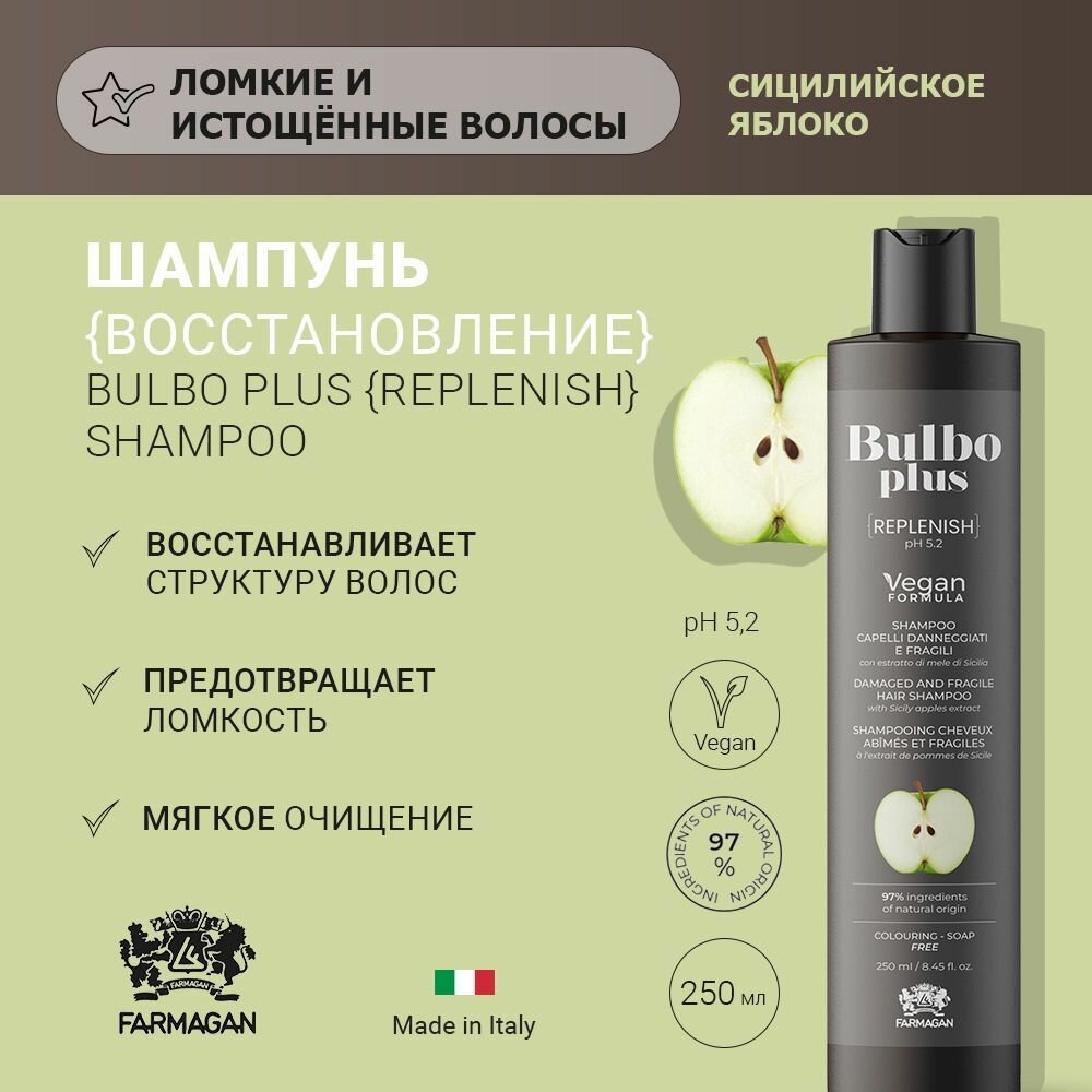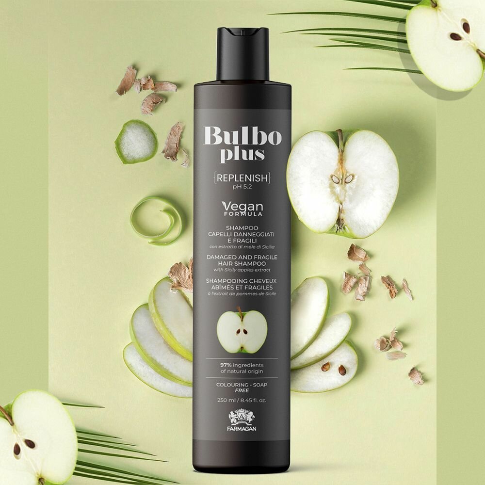 {СИЛА ПРИРОДЫ} Bulbo-это новая профессиональная линия Farmagan, созданная для естественного благополучия волос и кожи головы.Серия Bulbo PLUS-это cкорая помощь для сильно повреждённых волос.Farmagan Bulbo Plus Replenish Shampoo Шампунь Восстановление для поврежденных и ломких волос идеальный продукт для ослабленных и ломких волос. Деликатно очищает волосы. Благодаря экстракту сицилийского яблока увлажняет волосы, придает им мягкость.Пантенол в формуле обладает укрепляющими свойствами. Инозитол в составе является залогом роста волос и важной составляющей их красоты, незаменим при выпадении волос, при кожных раздражениях, смягчает, обладает кондиционирующим действием, облегчает расчесывание. Подходит для чувствительной кожи головы. Веганская формула - 97% ингредиентов натурального происхождения.