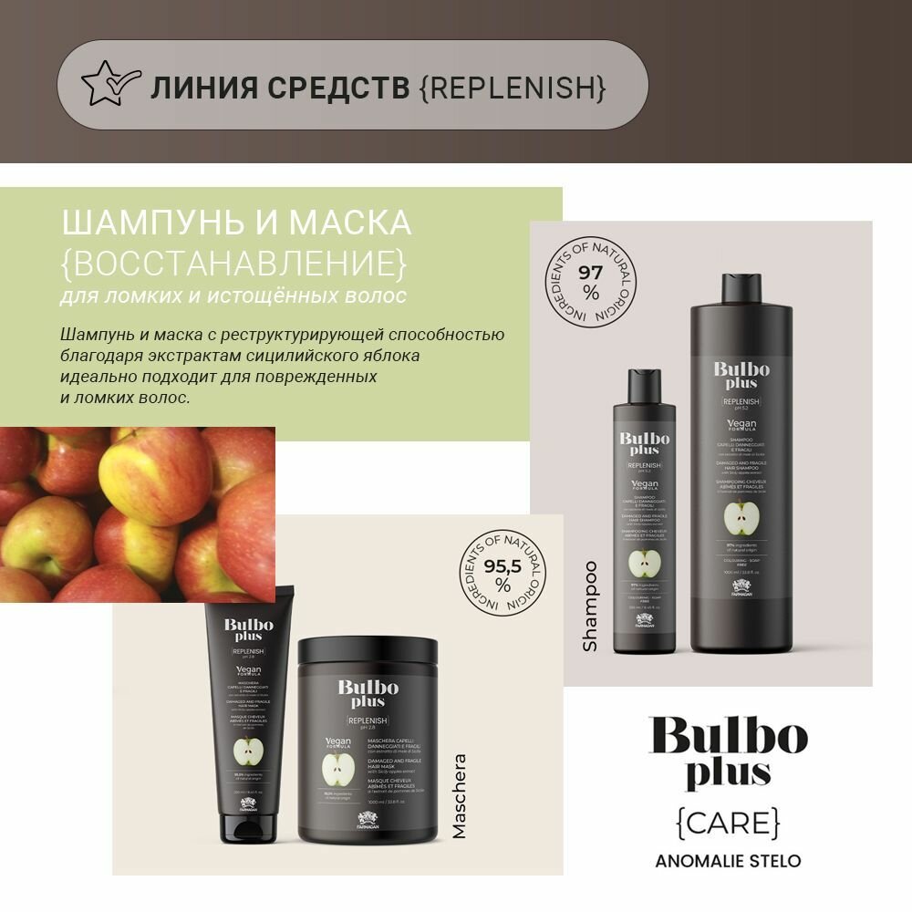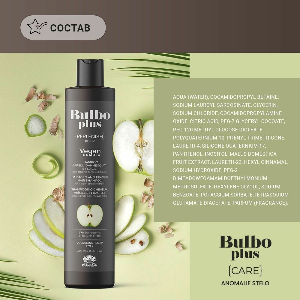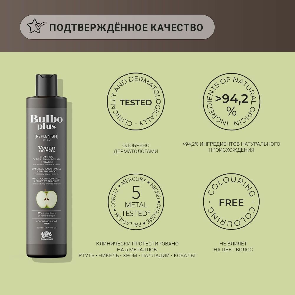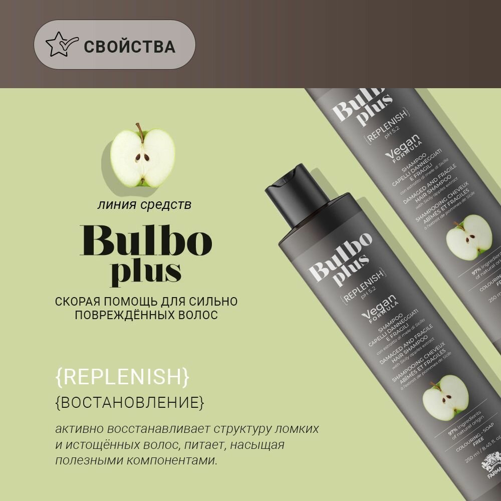 {СИЛА ПРИРОДЫ} Bulbo-это новая профессиональная линия Farmagan, созданная для естественного благополучия волос и кожи головы.Серия Bulbo PLUS-это cкорая помощь для сильно повреждённых волос.Farmagan Bulbo Plus Replenish Shampoo Шампунь Восстановление для поврежденных и ломких волос идеальный продукт для ослабленных и ломких волос. Деликатно очищает волосы. Благодаря экстракту сицилийского яблока увлажняет волосы, придает им мягкость.Пантенол в формуле обладает укрепляющими свойствами. Инозитол в составе является залогом роста волос и важной составляющей их красоты, незаменим при выпадении волос, при кожных раздражениях, смягчает, обладает кондиционирующим действием, облегчает расчесывание. Подходит для чувствительной кожи головы. Веганская формула - 97% ингредиентов натурального происхождения.