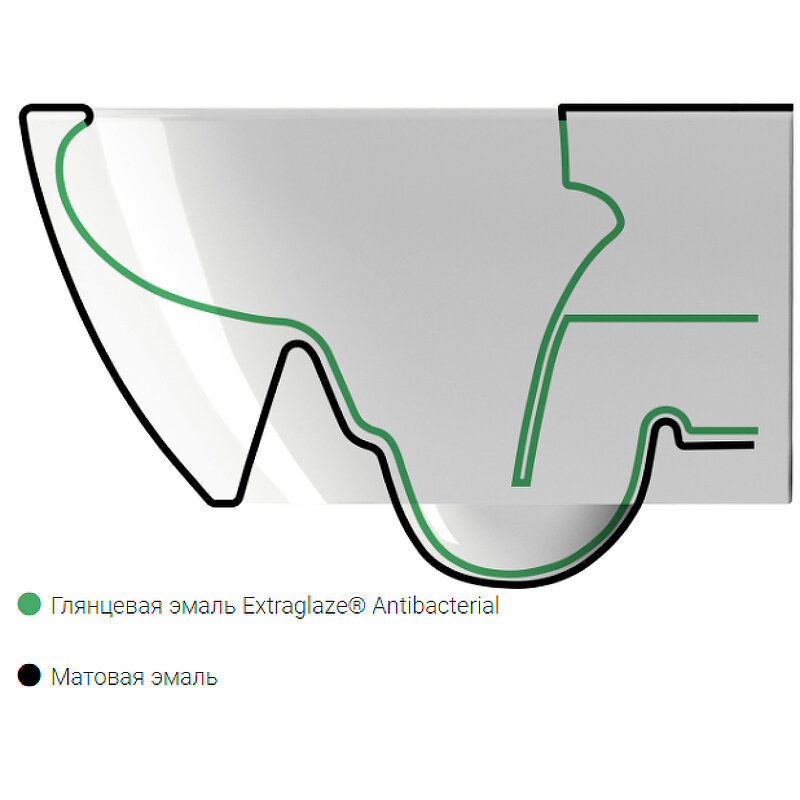 - Технология Dual Glaze: чистота матового эффекта граничит с антибактериальной эмалью Extraglaze Antibacterial в местах соприкосновения с водой, предотвращая негигиеничные образования пятен и отложений. И наоборот, гладкость керамической поверхности в эмали Extraglaze уменьшает трение воды во время смыва унитаза, улучшая производительность и значительно сокращая потребление воды.