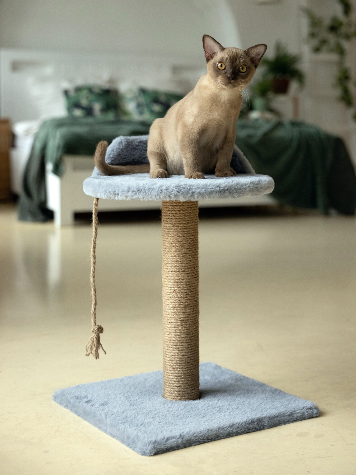 Вертикальная когтеточка для кошек столбик. Размер основания - 30*30 см, высота общая 52 см, высота кошачей когтеточки 40 см. Обмотка когтеточки - джутовый канат. Диаметр столба - 6 см. Преимущества когтеточки для котенка:Только прочные фанерные втулки в когтеточке столбике. Никакого пластика! Прочный джутовый канат проклеен по всей длине когтеточки.Мягкая приятная обивка.Просторная лежанка для кота.Игровой комплекс собирается за полминуты. Инструменты для сборки не требуются.Приятные цвета на выбор. Разумная цена.Российское производство с опытом более 20 лет.Внимание! Собирать строго по инструкции. Для безопасной эксплуатации комплекс необходимо дополнительно зафиксировать.