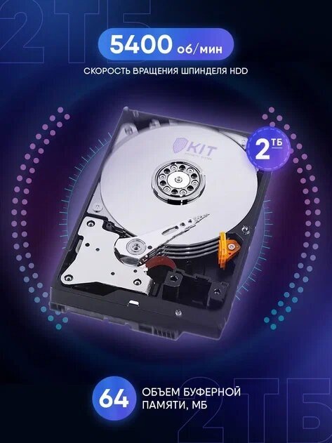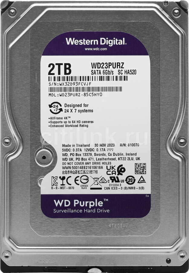 Жесткий диск WD Purple WD23PURZ, объем 2 Тб, форм-фактор 3.5", буферная память 256МБ, скорость вращения шпинделя 5400 об/мин, интерфейс SATA-III