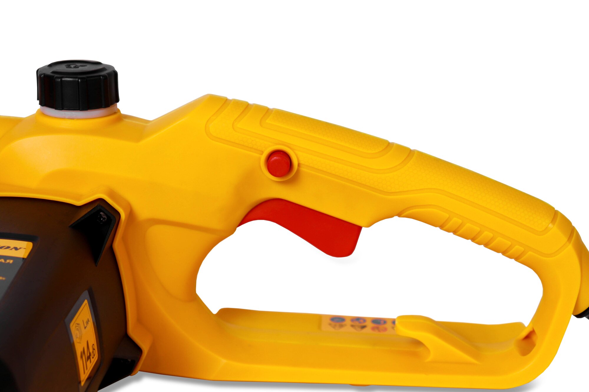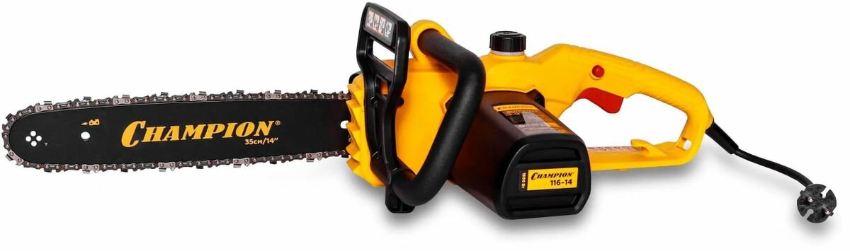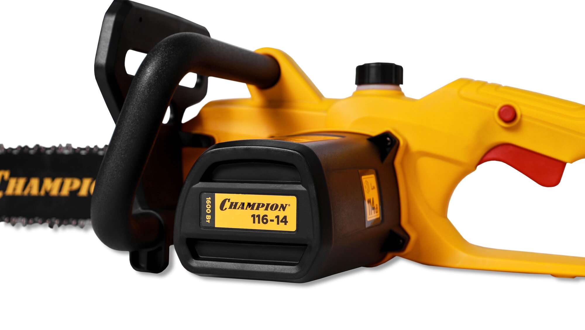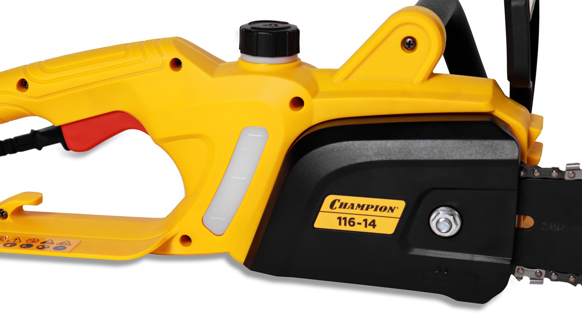 Электропила Champion 116-14 – идеальный выбор для выполнения различных задач по обрезке деревьев, распиливанию древесины и уходу за дачным и приусадебным участком. Вес пилы всего 3.14 кг, мощность – 1600 Ватт. Легкая и эргономичная, пила позволяет комфортно работать даже в труднодоступных местах. Благодаря увеличенному объёму масляного бака 0.15 л можно дольше работать, не отвлекаясь на дозаправку. Пила оснащена инерционным тормозом цепи, который срабатывает как при обратном ударе, так и при отпускании курка: как только вы прекращаете работать, цепь сразу же останавливается, что обеспечивает максимальную безопасность пользователя.