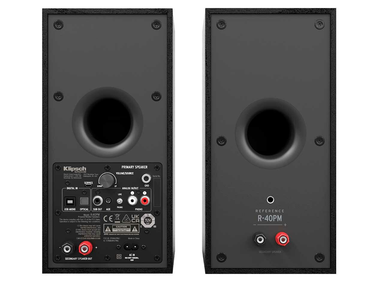 Пара Klipsch включает в себя ведущую АС (активный монитор) и ведомую АС (пассивный монитор), которая подключается к первой с помощью винтовых клемм и входящего в комплект кабеля. В корпус активного монитора встроены цифровые усилители с низким уровнем шума и фонокорректор, а на его тыльной панели находится регулятор громкости, совмещенный с селектором входов, и вся необходимая коммутация. Имеется пара RCA-разъемов которые можно использовать как в качестве линейного входа, так и в роли Phono-гнезд для подключения винилового проигрывателя (для выбора служит отдельный тумблер-селектор). Также присутствуют следующие входы: Aux (3.5 мм) для плеера или смартфона, USB-порт для подсоединения к компьютеру (PCM до 24 бит/96 кГц) и оптический разъем. Усилить басовый фундамент в Klipsch позволяет выход Sub Out для активного сабвуфера.