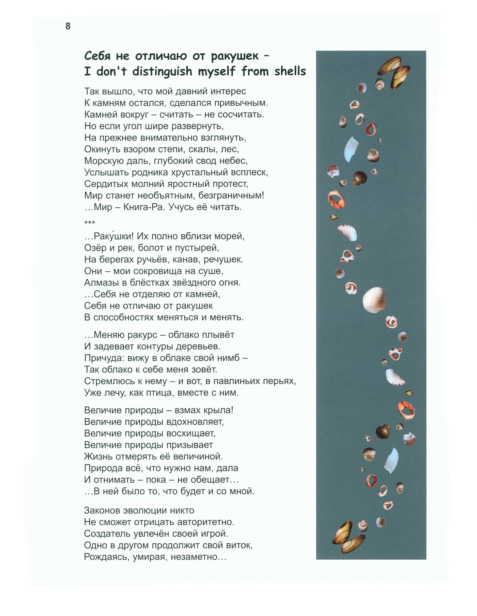 В основу представленных в этом альбоме художественных работ легли изображения на ракушках и рапанах, их осколках, сами ракушки и рапаны, испещрённые рисунками, выполненными самой природой. В них автор увидел своеобразные сюжеты, затем продолжил тему в своих картинах, используя оригинальную технику.