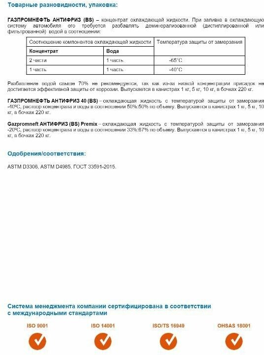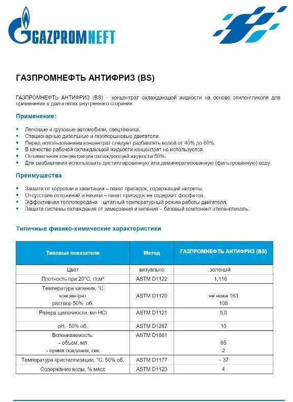 Газпромнефть антифриз BS 40 готовая к применению охлаждающая жидкость на основе этиленгликоля для применения в двигателях внутреннего сгорания.