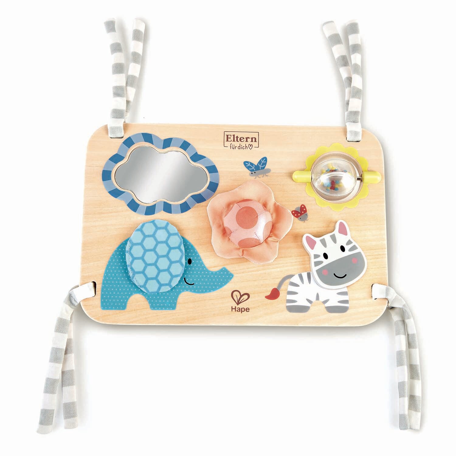 Стимулируйте чувства вашего ребенка! Эта забавная доска для занятий подарит вашим малышам часы исследовательской сенсорной игры. На доске, которую легко прикрепить к кроватке, манежу или любому другому месту, есть зеркало, слон с морщинистыми ушами, пищащий цветок, милая зебра со щелкающей головой и дребезжащий шарик из бисера, который можно крутить! Посмотрите на свое отражение в зеркале, а затем нажмите на цветок, чтобы услышать его писк! Исследуйте сморщенные уши слона, потрясите головой зебры, чтобы услышать милый щелкающий звук, и покрутите мяч, чтобы услышать, как он гремит! Отлично подходит для поощрения сенсорного развития, распознавания цветов и зрительно-моторной координации, а также любви к животным!