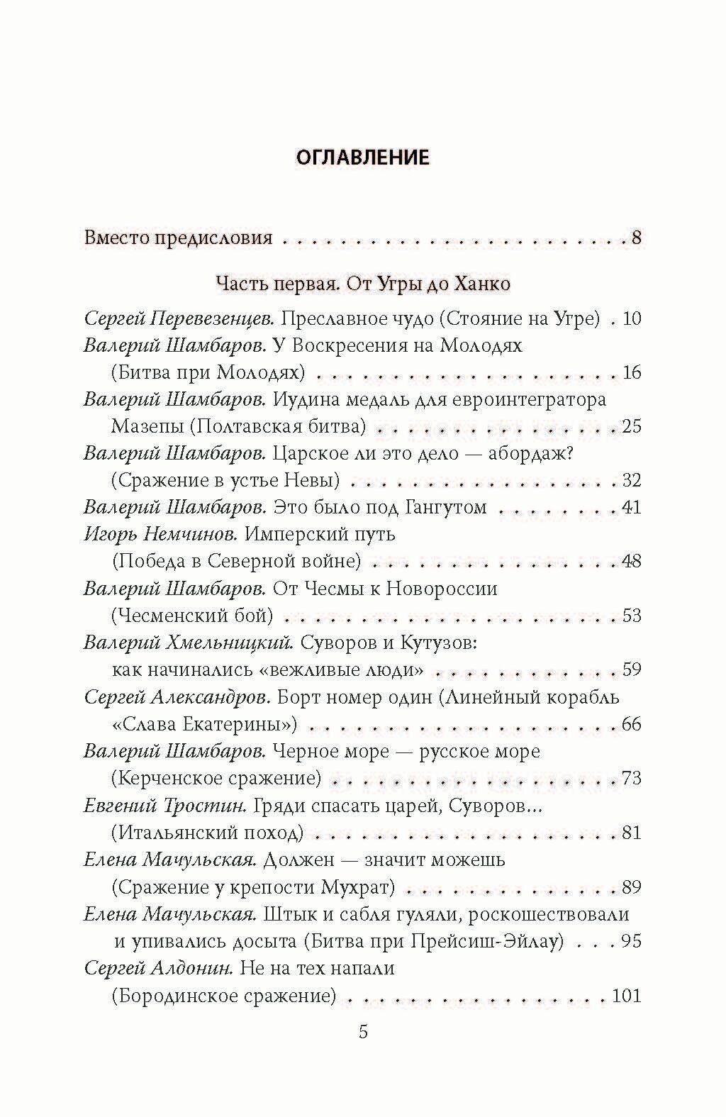 В книге представлены статьи о победах русского оружия, одержанных на разных этапах исторического развития России. Главные достоинства этих очерков, опубликованных ранее в журнале Никиты Михалкова "Свой" - оптимальный баланс державно-патриотического пафоса с историософским анализом, умение авторов рассказать о стратегических замыслах и хитроумной тактике русских военачальников понятным для широкой читательской аудитории языком, внятно выраженная идейная направленность, фактологическая точность.