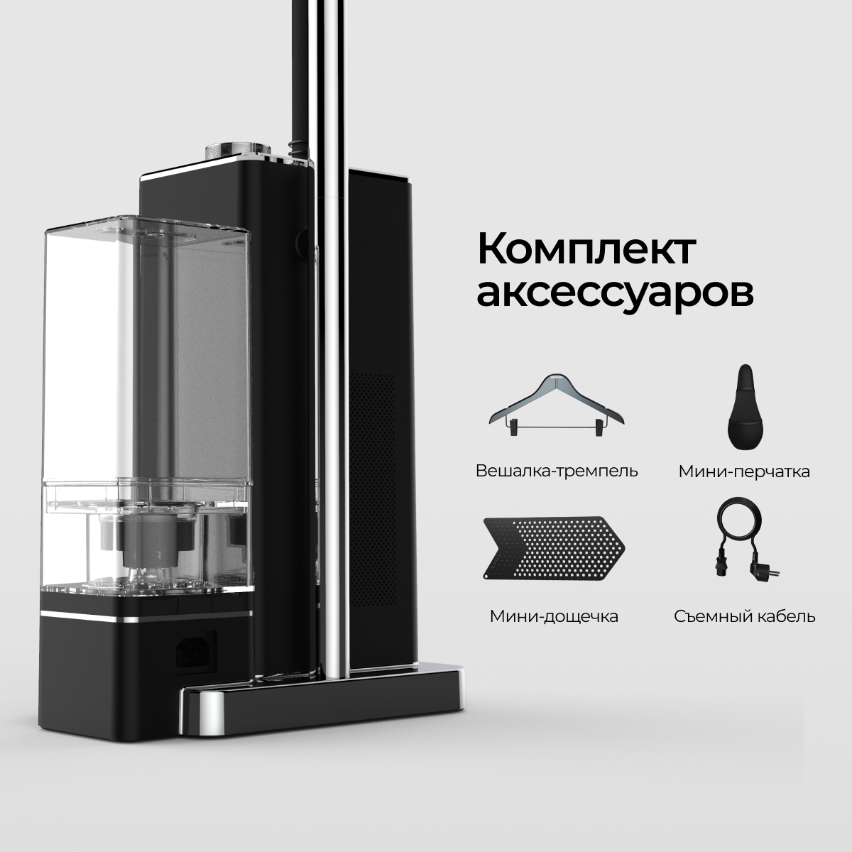 | Комплект поставки | база с резервуаром для воды, сборная штанга, шланг с ручкой-отпаривателем, вешалка-тремпель, термо-варежка, мини-доска для отпаривания мелких деталей, съемный шнур питания, батарейки 2 шт для системы ""Start and stop"" |