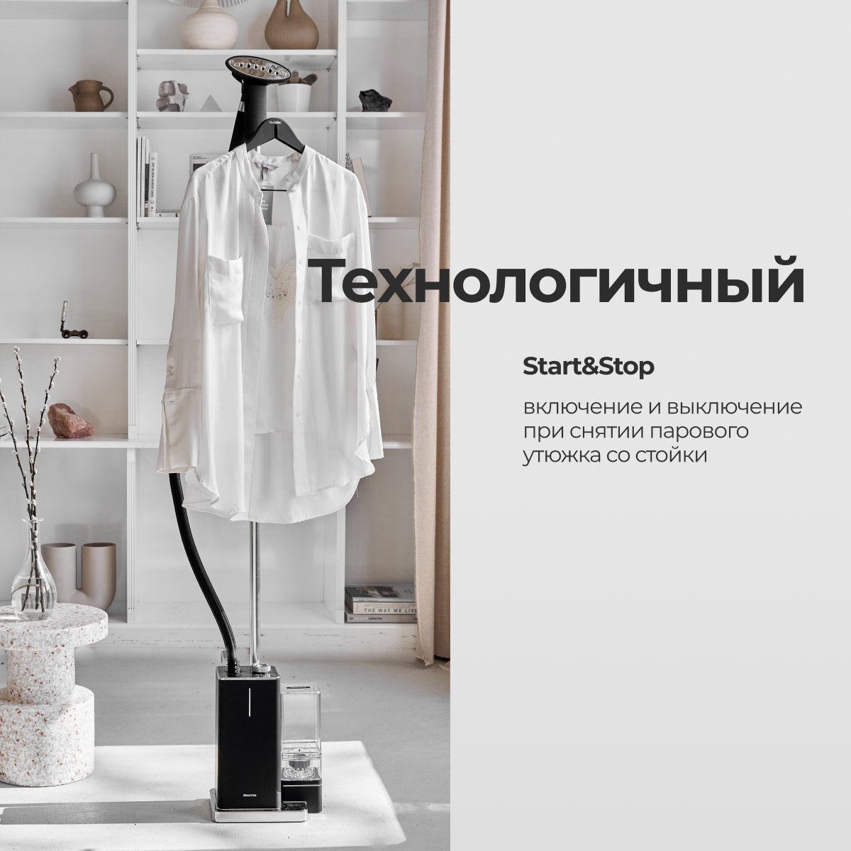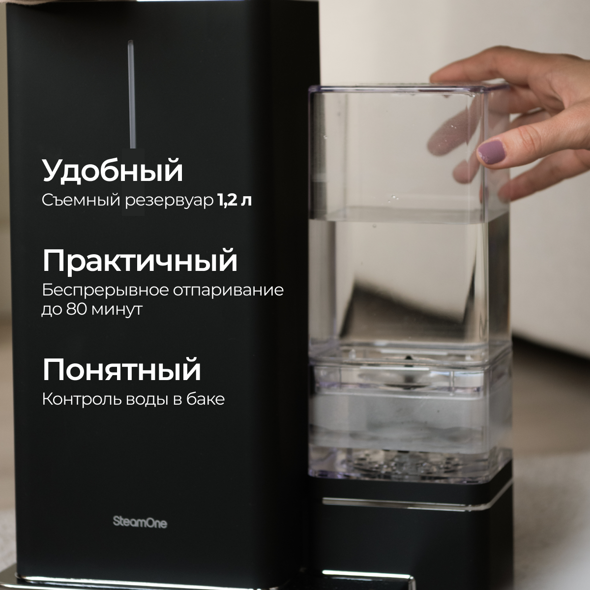 Вертикальный отпариватель SteamOne идеален как для интерьера, так и по техническим характеристикам. Съемный кабель поможет снизить визуальный шум в интерьере. Обновленный стильный дизайн и вынесенный наружу бак для воды на 1,2 литра просто не оставляют шансов не влюбиться в ! Мощность подачи пара 45 г/мин обеспечивает разглаживание заломов на любой ткани, а 3 режима работы помогут выбрать ту температуру, которая будет безопасна и эффективна для нужного типа ткани. Первый уровень мощности - для шелка и деликатных тканей; Второй уровень мощности - для шерсти и хлопка; Третий уровень мощности - для льна и интенсивного отпаривания тканей. Продолжительность работы - 80 минут. Система ""Start and stop"" позволяет экономить воду и автоотключает прибор, если он не используется. Благодаря этой технологии удаётся экономить до 40% воды, т.к. она не расходуется, когда устройство выключено. Система ""Anti-calc"" защищает от образования накипи и продлевает срок службы прибора. Паровая головка разработана таким образом, чтобы вертикальный отпариватель обеспечивал наилучшее распространение пара без ущерба для маневренности. Отпариватель легкий и защищен теплоизоляционной пеной, что позволяет легко разгладить одежду. Постоянный и оптимизированный поток пара обеспечивает комфорт, эффективность и предотвращает попадание воды на одежду. Вертикальный отпариватель удаляет 99,99% микробов, бактерий и вирусов с тканей за один раз. Это означает, что помимо отпаривания вы можете очистить свою одежду и особенно пальто после поездки в общественном транспорте или пиджак после похода в клуб, чтобы удалить запахи, или просто очистить столовое и постельное бельё! Элегантный и компактный дизайн. Устройство стильное и изящное, легко помещается в углу комнаты и сочетается с декором. Без ущерба для эффективности конструкция изделия оптимизирована так, что занимает мало места. Каждый материал продуман до мелочей, чтобы облегчить жизнь пользователя, включая термошланг с тройной защитой, чтобы избежать ожогов во время отпаривания. В комплекте прилагается вешалка-тремпель для отпаривания разной одежды. А также мини дощечка – для легкого отпаривания воротников и манжет. Обновленная перчатка SteamOne позволяет защитить руки во время отпаривания ткани. Подарите своим любимым отпариватель SteamOne на любой праздник: день рождение, юбилей, свадьбу или новоселье и привнесите в жизнь своих близких комфорт и заботу.