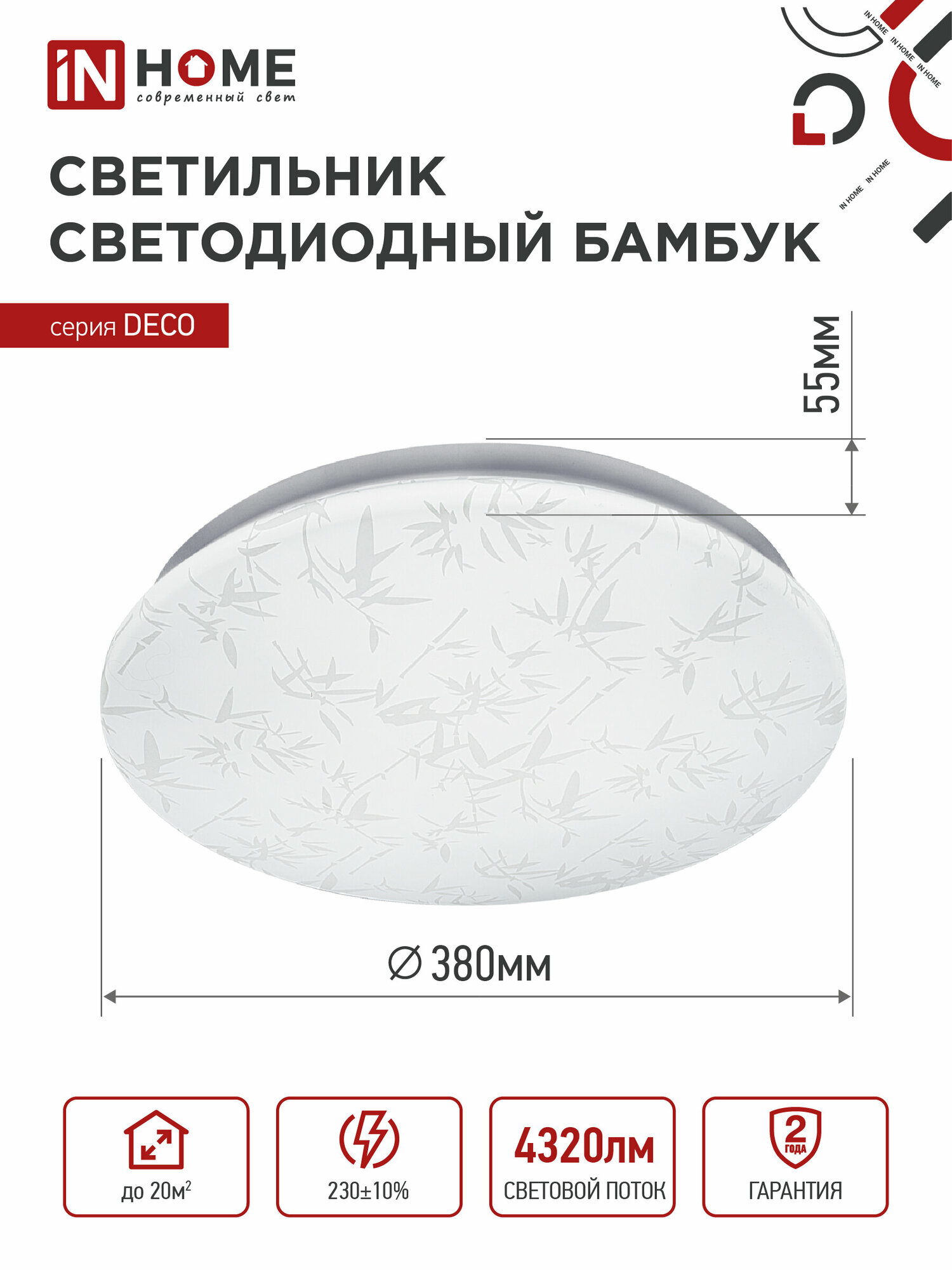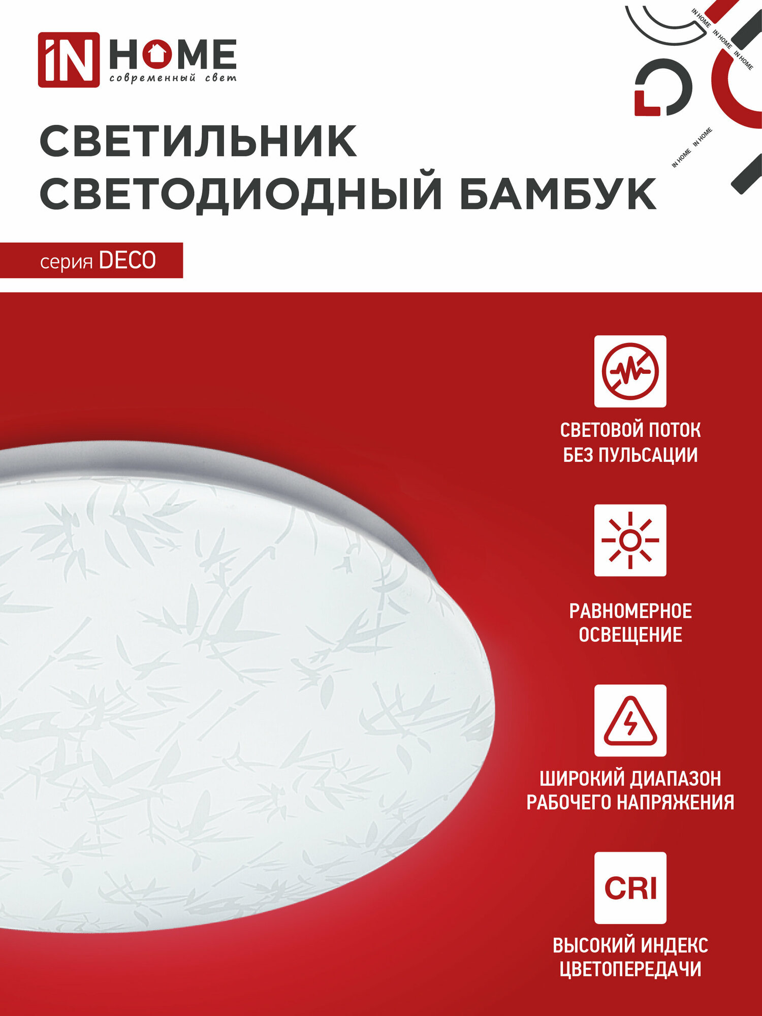 Светодиодный светильник БАМБУК серии DECO IN HOME в светлом матовом корпусе украшен принтом в виде стилизованных листьев бамбука. Согласно древнему китайскому учению фен-шуй, изображение этого растения приносит в дом удачу, счастье и процветание. Светодиодные светильники БАМБУК серии DECO предназначены для внутреннего освещения жилых помещений, подъездов и сферы ЖКХ, офисных и административных учреждений, магазинов, а также холлов, коридоров, лестничных пролётов, подсобок и других помещений вспомогательного назначения. Современные светильники серии DECO, работающие на основе последнего поколения светодиодов, обеспечивают яркий равномерный световой поток при максимальной экономии электроэнергии. Отсутствие пульсации гарантирует сохранность здоровья глаз.