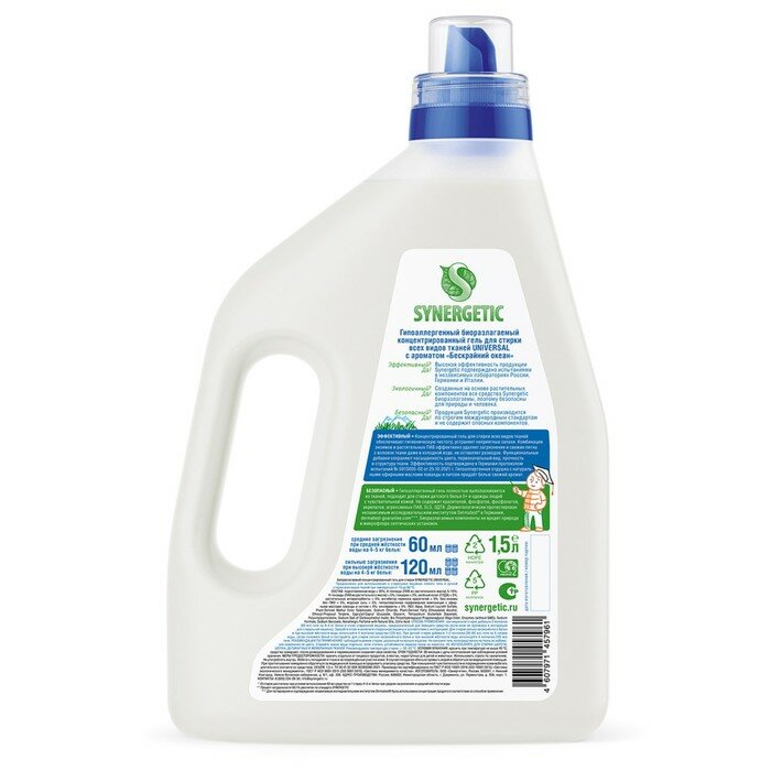 Биоразлагаемый концентрированный гель для стирки всех видов тканей SYNERGETIC UNIVERSAL с ароматом "Бескрайний океан" обеспечивает бережное и эффективное очищение тканей, гигиеническую чистоту одежды и устраняет неприятные запахи. Средство можно использовать в стиральных машинах любого типа и при ручной стирке при температуре 15 - 90 C. Комбинация энзимов и растительных ПАВ эффективно удаляет трудновыводимые и свежие пятна с волокон ткани даже в холодной воде. Функциональные добавки предотвращают окрашивание ткани, сохраняя ее первоначальный вид, насыщенность цвета, прочность и структуру. Гипоаллергенная отдушка на основе эфирных масел лаванды и литсеи оставляет легкий и приятный аромат. Гель предназначен для стирки всех видов тканей, кроме деликатных и мембранных, а также шерсти и шелка. Биоразлагаемый гель полностью выполаскивается из тканей, подходит для стирки детского белья 0+ и одежды людей с чувствительной кожей.
