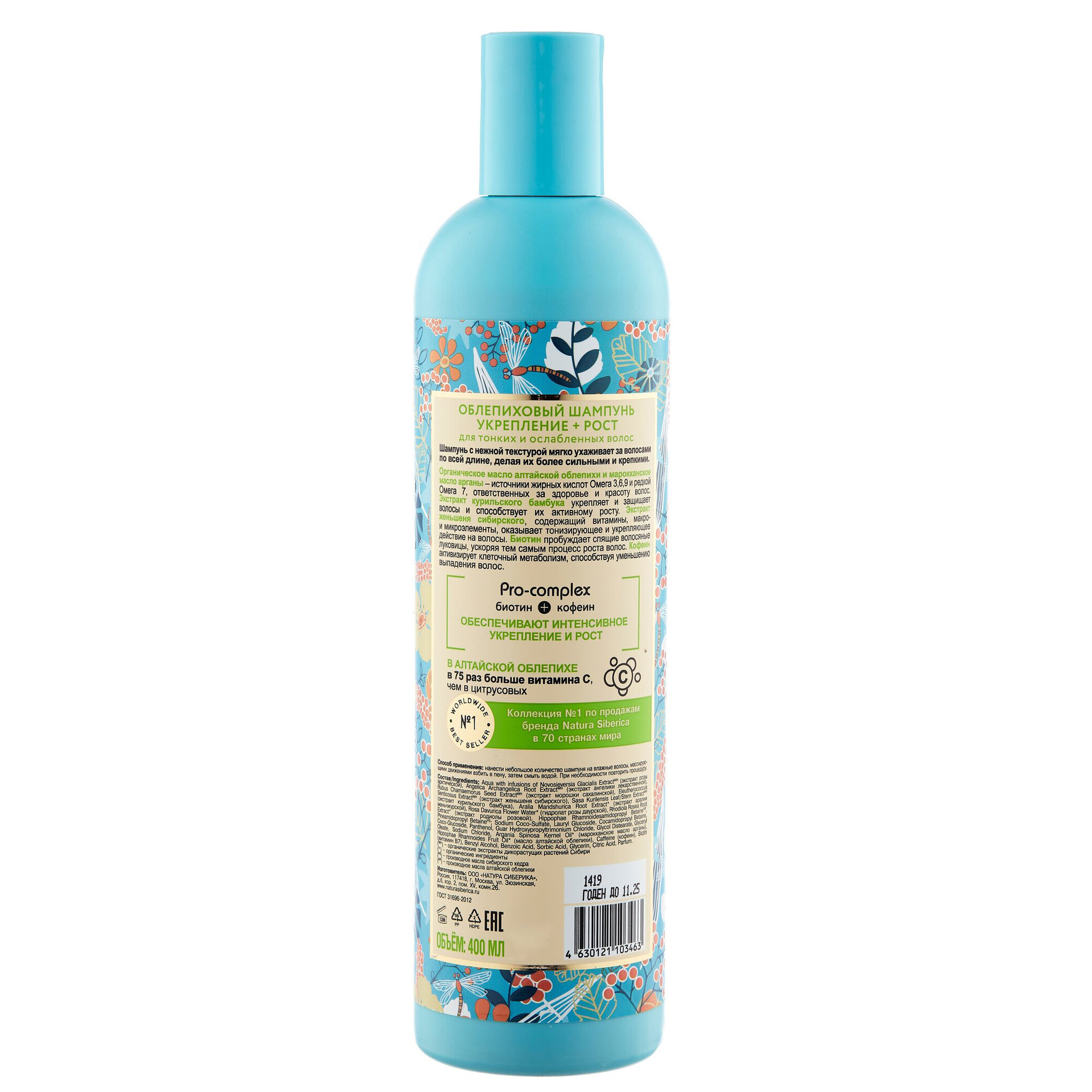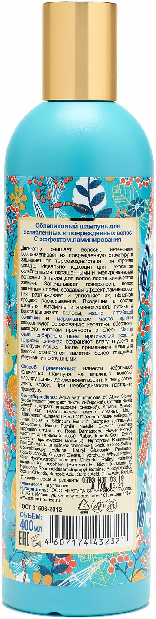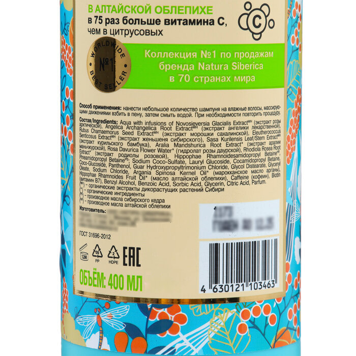 | Состав | Aqua with infusions of Novosieversia Glacialis ExtractWH (экстракт розы арктической), Angelica Archangelica Root ExtractWH (экстракт ангелики лекарственной), Rubus Chamaemorus Seed ExtractWH (экстракт морошки сахалинской), Eleutherococcus Senticosus ExtractWH (экстракт женьшеня сибирского), Sasa Kurilensis Leaf/Stem ExtractWH (экстракт курильского бамбука), Aralia Mandshurica Root Extract* (экстракт аралии маньчжурской), Rosa Davurica Flower Water* (гидролат розы даурской), Rhodiola Rosea Root Extract* (экстракт родиолы розовой), Hippophae Rhamnoidesamidopropyl BetaineHR, Pineamidopropyl BetainePS; Sodium Coco-Sulfate, Lauryl Glucoside, Cocamidopropyl Betaine, Coco-Glucoside, Panthenol, Guar Hydroxypropyltrimonium Chloride, Glycol Distearate, Glyceryl Oleate, Sodium Chloride, Argania Spinosa Kernel Oil* (марокканское масло арганы), Hippophae Rhamnoides Fruit Oil* (масло алтайской облепихи), Сaffeine (кофеин), Biotin (витамин B7), Benzyl Alcohol, Benzoic Acid, Sorbic Acid, Glycerin, Citric Acid, Parfum. (*) – органические ингредиенты (WH) – органические экстракты дикорастущих растений Сибири (PS) – производное масла сибирского кедра (HR) – производное масла алтайской облепих |